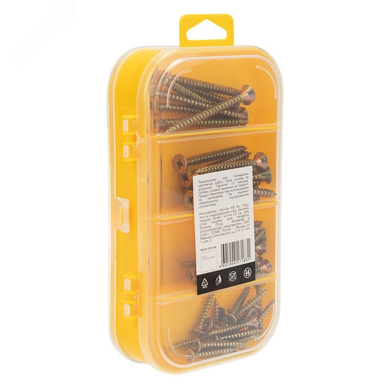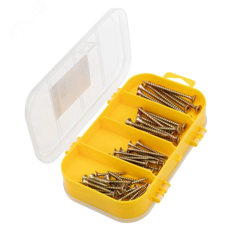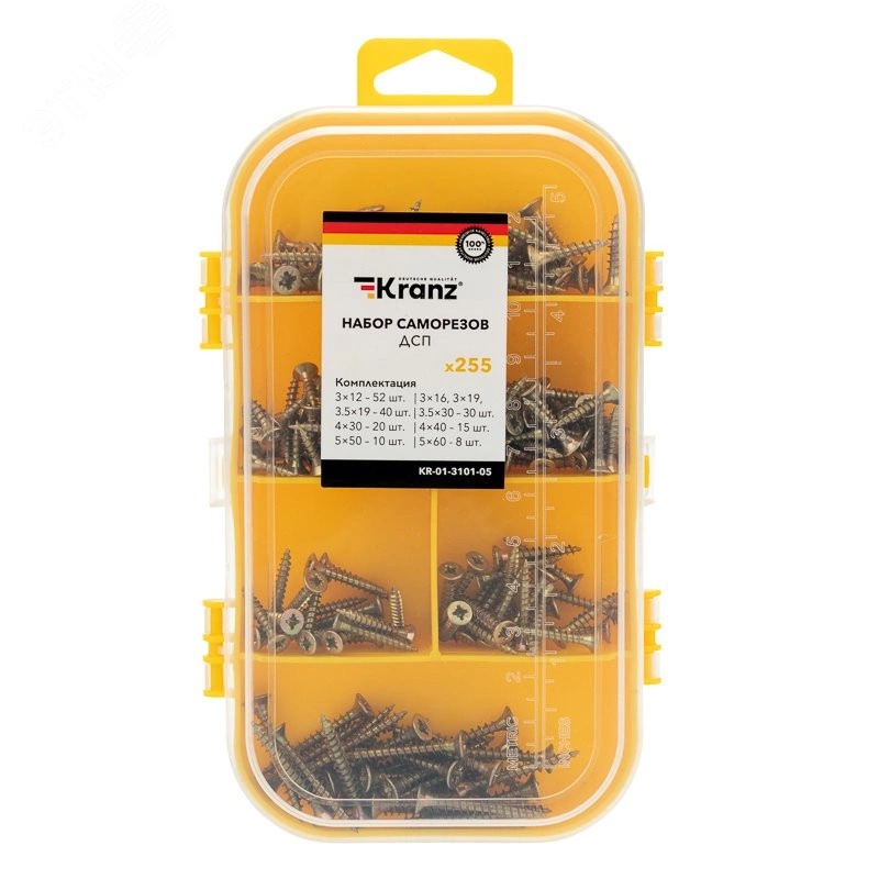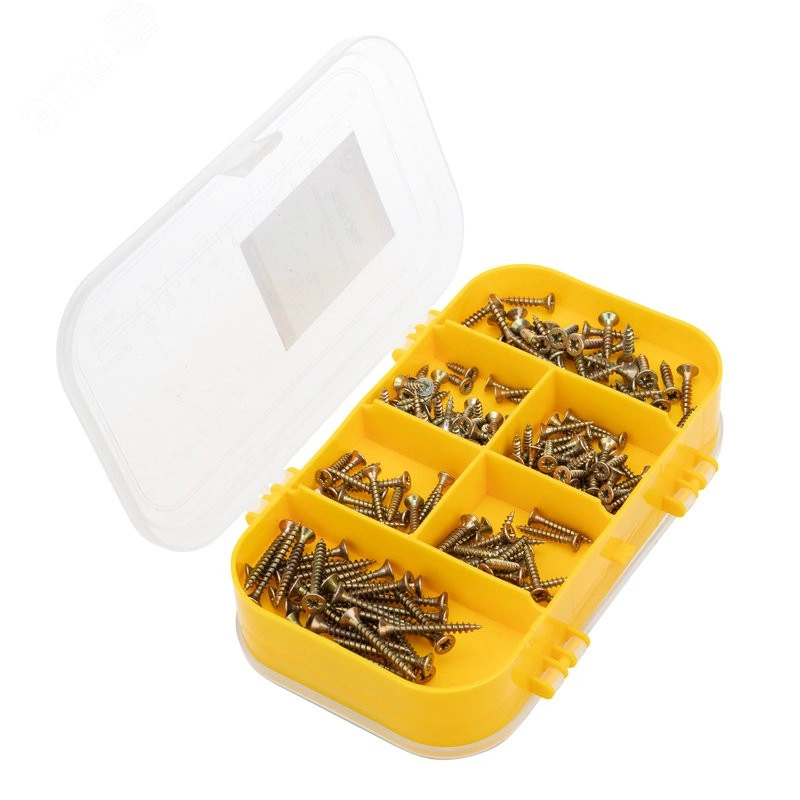 Саморезы в наборе используются для соединения деревянных предметов и фиксации деталей из других материалов к деревянным поверхностям. Например, консолей к полке или петель и замка к двери. Набор состоит из 1. Саморезы для ДСП - 3,0x12 - 52 шт, - 3,0x16 - 40 шт, - 3,0x19 - 40 шт, - 3,5x19 - 40 шт, - 3,5x30 - 30 шт, - 4,0x30 - 20 шт, - 4,0x40 - 15 шт, - 5,0x50 - 10 шт, - 5,0x60 - 8 шт. 2. Пластиковый органайзер.