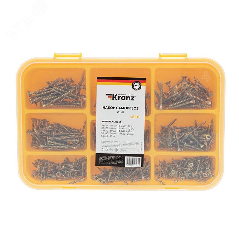 Саморезы в наборе используются для соединения деревянных предметов и фиксации деталей из других материалов к деревянным поверхностям. Например, консолей к полке или петель и замка к двери. Набор состоит из 1. Саморезы для ДСП- 3,0x16 -120 шт,- 3,5x20 - 80 шт, - 3,5x25 - 60 шт, - 4,0x25 - 60 шт, - 4,0x30 - 60 шт, - 4,0x40 - 50 шт, - 5,0x40 - 30 шт, - 5,0x50 - 25 шт, - 5,0x60 - 25 шт. 2. Пластиковый органайзер.