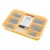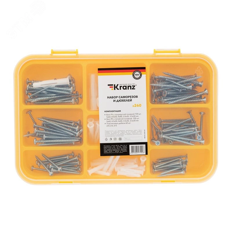 Набор универсального крепежа для внутренних работ. Возможно использование в следующих основаниях - дерево, бетон, кирпичные стены. Набор состоит из 1. Саморезы с полукруглой головкой, Ph - 5,0х60 мм - 20 шт, - 4,5х50 мм - 20 шт, - 4,0х40 мм - 20 шт, - 3,5х35 мм - 20 шт, - 3,5х30 мм - 20 шт. 2. Саморезы с потайной головкой, Ph - 5,0х60 мм - 20 шт, - 4,5х50 мм - 20 шт, - 4,0х40 мм - 20 шт, -3,5х35 мм - 20 шт, - 3,5х30 мм - 20 шт. 3. Пластиковые дюбели d8 - 20 шт, d6 - 20 шт, d5 - 20 шт. 4. Пластиковый органайзер.