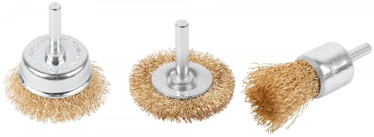 Набор щеток для дрели со шпильками, 2 ''Чашки'' (25 и 50 мм) и 1 ''Плоская'' 50 мм, латунированная витая проволока 0,3 мм, Cutop profi . Предназначена для мягкой качественной зачистки различных металлических и деревянных поверхностей, снятия ржавчины, удаления лакокрасочных покрытий и других загрязнений. Тип ''Плоская'' оптимально подходит для обработки углов, пазов, изгибов и других труднодоступных участков. Форма ''Чашка'' обеспечивает хорошую площадь прилегания к по- верхности. Упаковка – Блистер.