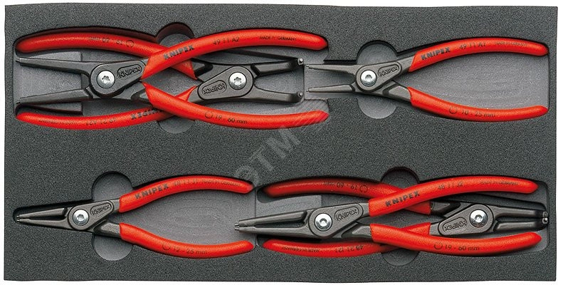 Набор клещей Ложементы из поропласта для верстака и автомастерской. для лучшего обзора при хранении инструментов. ячейки повторяют формы размещаемых инструментов. Размеры поропластового ложемента (Д х Ш х В) 335 x 165 x 33 мм. ложемент из пеноматериала с закрытыми порами, двухцветный. 6 прецизионных щипцов для стопорных колец во вкладыше из поропласта.