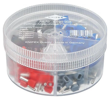 97 99 908 Наборы Практичная коробка для наборов, которую можно ставить одну на другую. удобная прозрачная коробка. поворотная крышка с отверстием для извлечения контактных гильз. с изолированными контактными гильзами, стандартная цветовая кодировка. Формат - диаметр 90 мм, высота 44 мм. Комплект поставки - 50 x KNIPEX Сдвоенные контактные гильзы серый 16 mm (2 x 0,75 mm?/ AWG 2 x 18), 50 x KNIPEX Сдвоенные контактные гильзы Красный 15 mm (2 x 1 mm?/ AWG 2 x 17), 50 x KNIPEX Сдвоенные контактные гильзы черный 18 mm (2 x 1,5 mm?/ AWG 2 x 15), 50 x KNIPEX Сдвоенные контактные гильзы Синий 18 mm (2 x 2,5 mm?/ AWG 2 x 13),