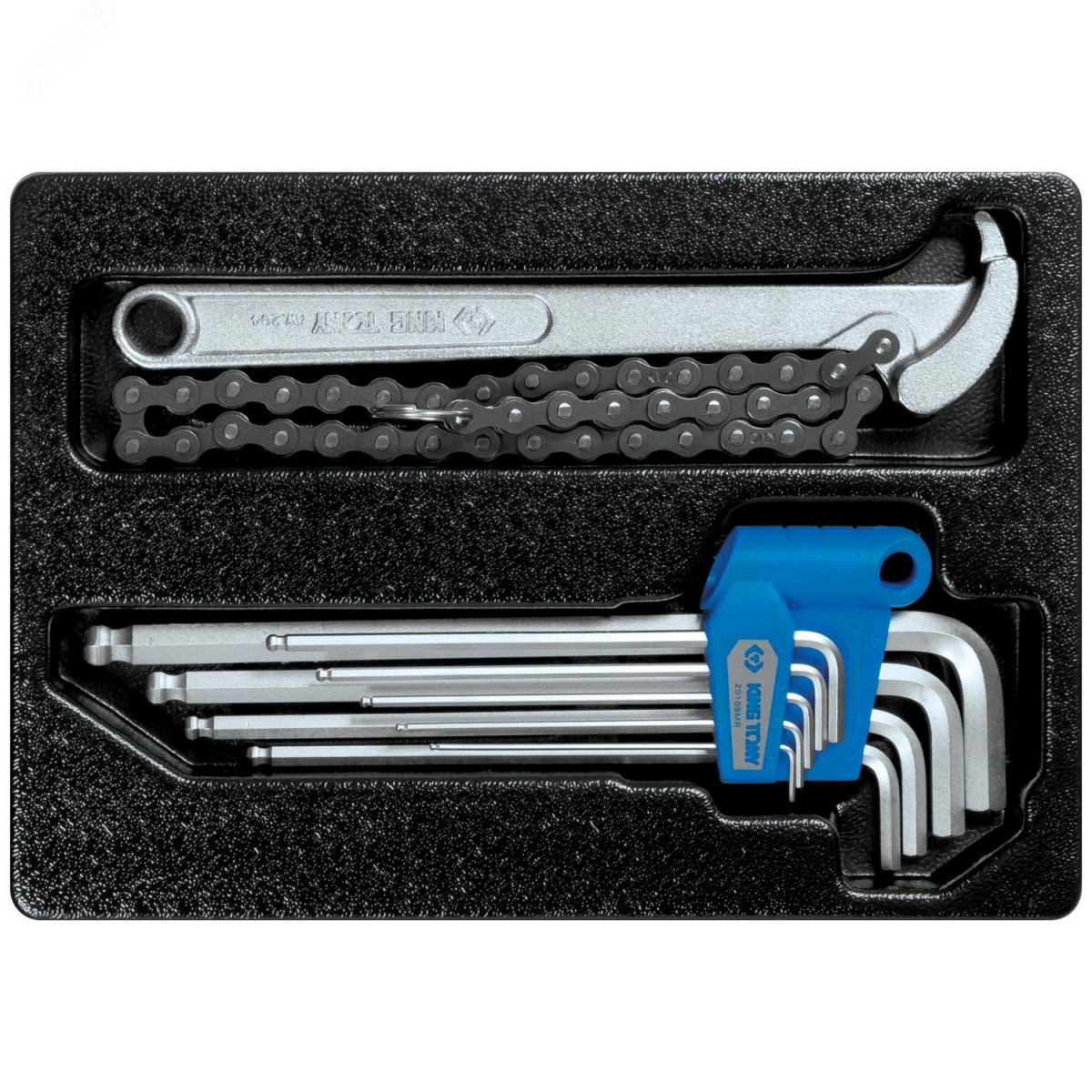 Набор шестигранников Г-образных и съемник масляных фильтров, ложемент, KING TONY 9-20110MR состоит из угловых ключей и цепного съемника с диапазоном обхвата. Представленный комплект подходит для использования в профессиональной сфере по ремонту и обслуживанию автомобильного транспорта. Изделия расположены на ложементе, станут оптимальным дополнением к инструментальной тележке.