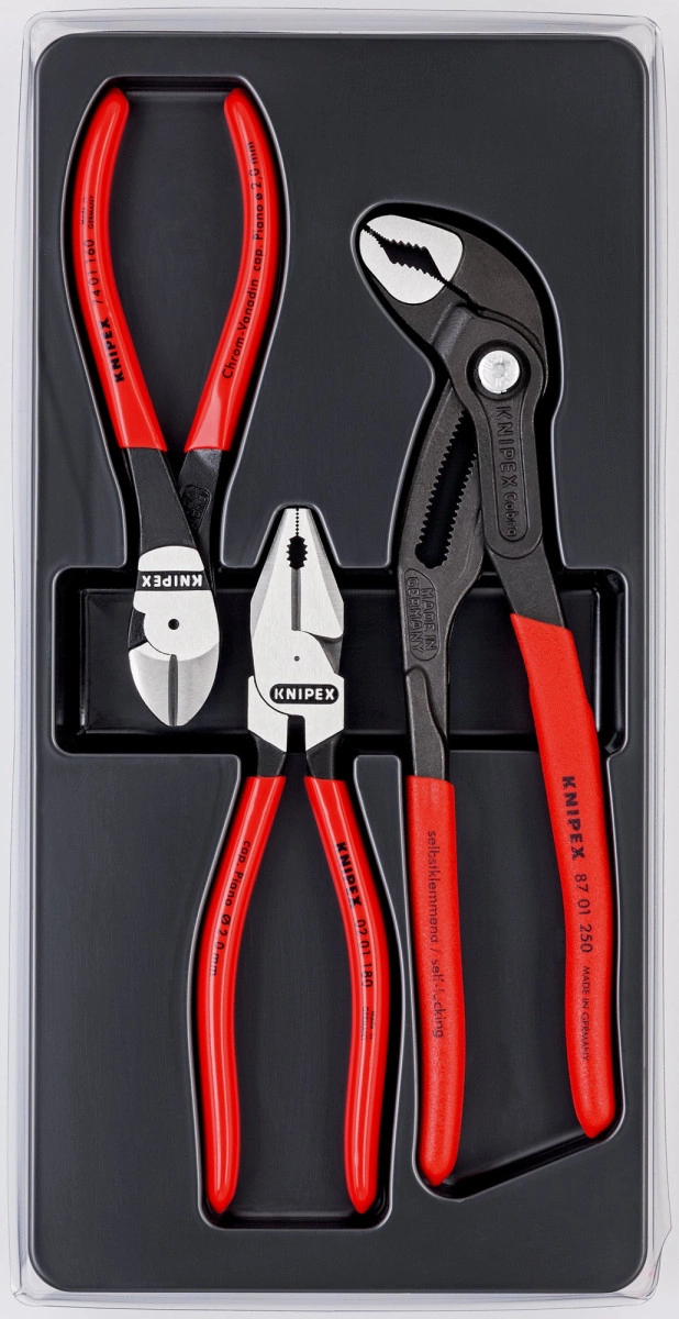 00 20 10 Коробка с инструментами особой мощности привлекательная упаковка для системы самообслуживания,с отверстием под крючок. инструменты в блоке из пластика глубокой штамповки с прозрачной крышкой. размеры (Ш х В х Г) - 170 x 370 x 40 мм. Инструменты с полированными головками и пластмассовыми чехлами. Комплект поставки - 1 x 02 01 180 KNIPEX Плоскогубцы комбинированные особой мощности, 1 x 87 01 250 KNIPEX Cobra Высокотехнологичные сантехнические клещи, 1 x 74 01 160 KNIPEX Бокорезы особой мощности,