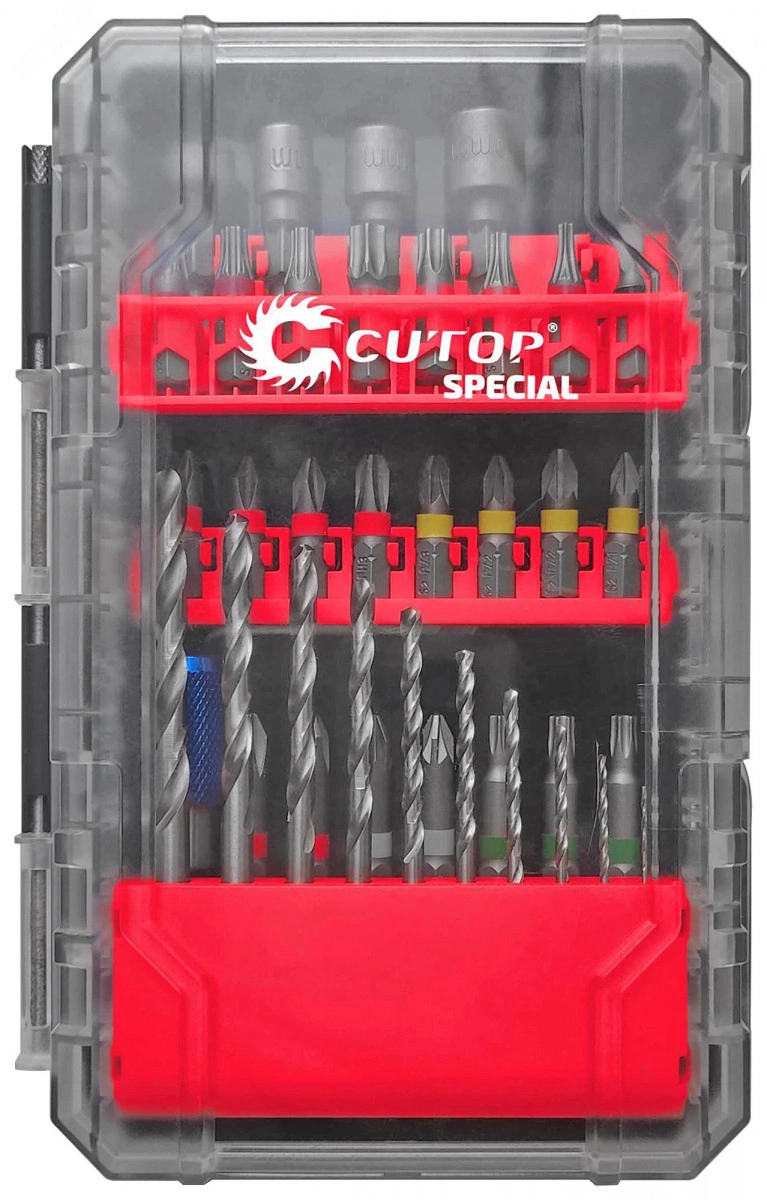Набор бит и сверл ''Строитель'' Cutop Special, состоящий из 39 предметов, предназначен для кровельных работ. Биты произведены по технологии CUTOP, изготавливаются из тайваньской стали высшего качества марки S2. Ребра бит производятся с помощью холодной штамповки в соответствии с точной спецификацией. Шлицы проходят специальный процесс закалки при температурах до 870 градусов Цельсия — в результате их твердость достигает 60 HRC, что увеличивает срок службы оснастки. Сверла изготовлены из высококачественной стали типа HSS. Предназначены для сверлений отверстий в углеродистых и легированных сталях, серых и ковких чугунах, цветных металлах и пластике.