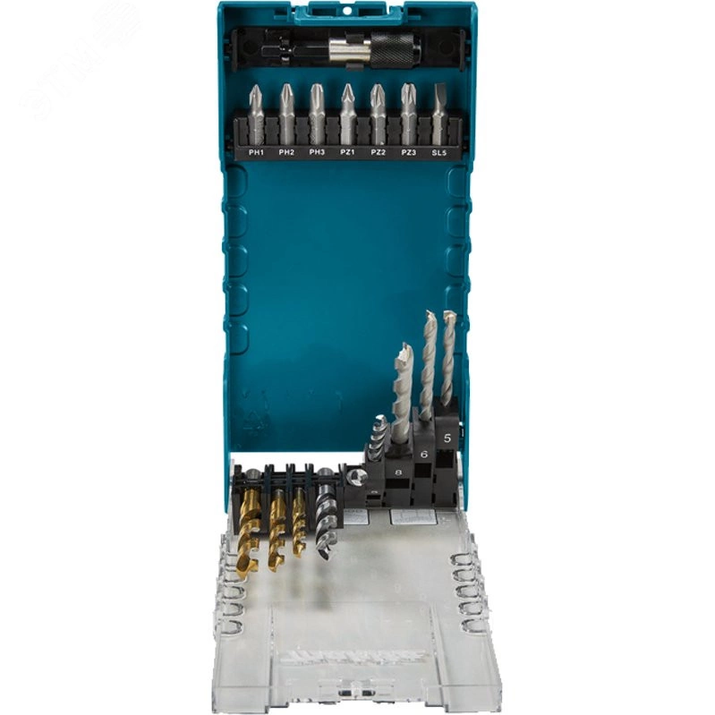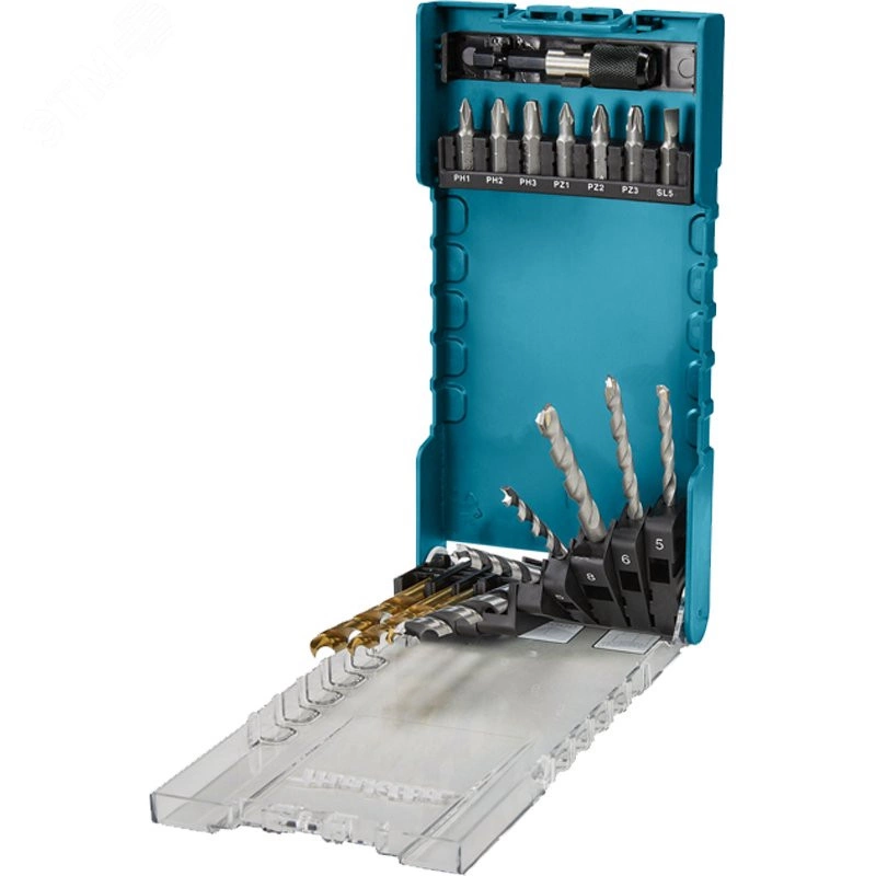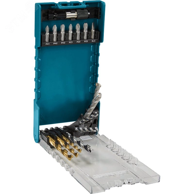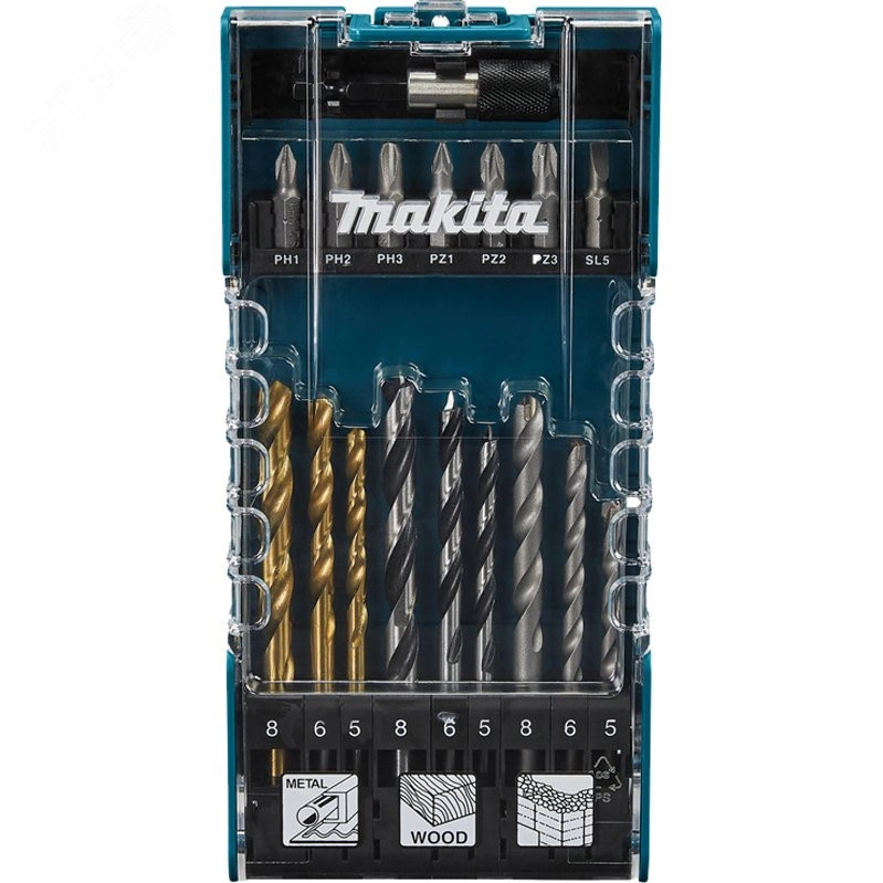 "Набор бит и сверл состоит из 17 предметов в удобной пластиковом футляре. Состав набора- 3 сверла по дереву, 3 сверла по металлу, 3 сверла по камню, 7 насадок 25 мм и магнитный держатель бит. В наборе Биты с резьбой 1/4"", форма C, длина 25 мм, с посадкой- PH1, PH2, PH3, PZ1, PZ2, PZ3, SL5. 3 сверла по металлу HSS-TiN размером 5x86, 6x93, 8x117 мм. 3 сверла по дереву размером 5x86, 6x93, 8x117 мм. 3 сверла по кладке размером 5x85, 6x100, 8x110 мм. Магнитный держатель бит 60 мм. Высокое качество материалов Makita гарантирует долгий срок службы."