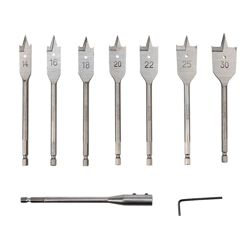Набор сверл перовых по дереву 9 предметов: 14-16-18-20-22-25-30х152мм удлинитель ключ угловой Kranz KR-91-0762