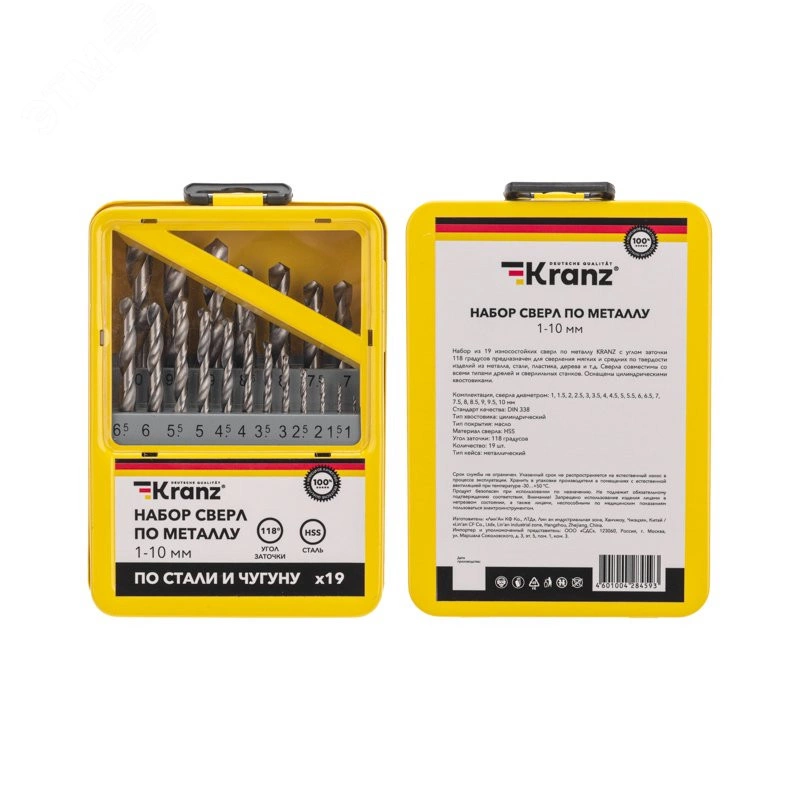 Набор из 19 износостойких сверл по металлу (1-10 мм) KRANZ с углом заточки 118 градусов предназначен для сверления мягких и средних по твердости изделий из металла, стали, пластика, дерева и т. д. Сверла совместимы со всеми типами дрелей и сверлильных станков. Оснащены цилиндрическими хвостовиками. Изделия выполнены из высококачественной быстрорежущей стали. Материал и технология производства гарантируют высокую производительность, долговечность и износостойкость сверл. Набор упакован в надежный металлический кейс, что делает процесс хранения и использования удобным и практичным.