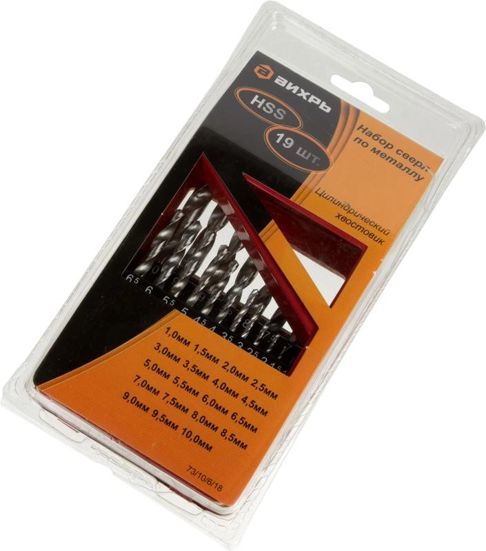 Полное описание: Набор сверл по металлу 1-10мм (через 0 5мм) HSS металл.коробка цилиндрический хвостовик (уп.19шт) Вихрь 73/10/6/18