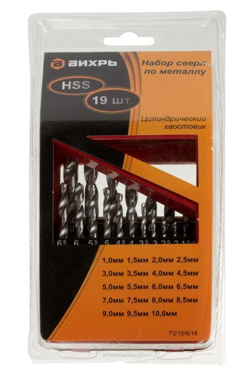 Набор сверл по металлу 1-10мм (через 0 5мм) HSS металл.коробка цилиндрический хвостовик (уп.19шт) Вихрь 73/10/6/18