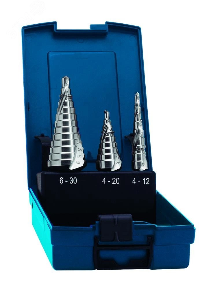 Набор сверл ступенчатых, 3 пр., HSS, d 4-12, 4-20, 6-30 мм, спиральная канавка, трехплоскостной хвостовик, CBN шлифовка
