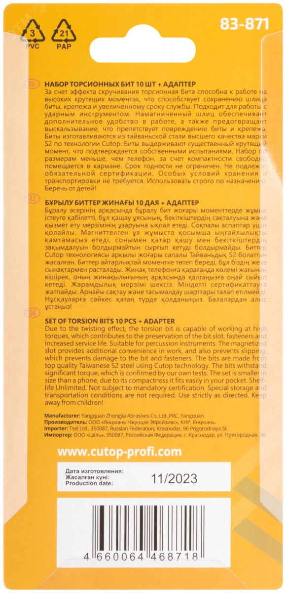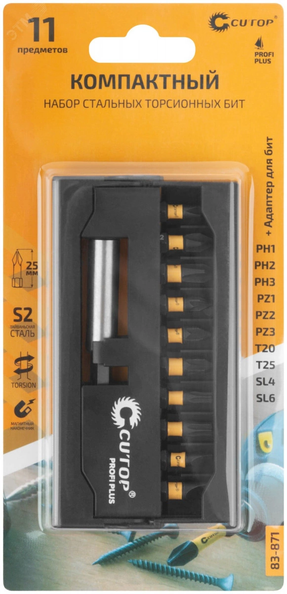 Компактный набор торсионных бит Cutop Profi Plus, состоящий из 11 предметов, предназначен для использования с шуруповертами и гайковертами. Подходит для работы с ударным инструментом. Биты произведены по технологии CUTOP, изготавливаются из тайваньской стали высшего качества марки S2. За счет эффекта скручивания торсионная бита способна к работе на высоких крутящих моментах, что способствует сохранению шлица биты, крепежа и увеличенному сроку службы. Намагниченный шлиц обеспечивает дополнительное удобство в работе, а также предотвращает выскальзывание, что препятствует повреждению биты и крепежа. Биты выдерживают существенный крутящий момент, что подтверждается собственными испытаниями. За счет компактности набор легко помещается в кармане.