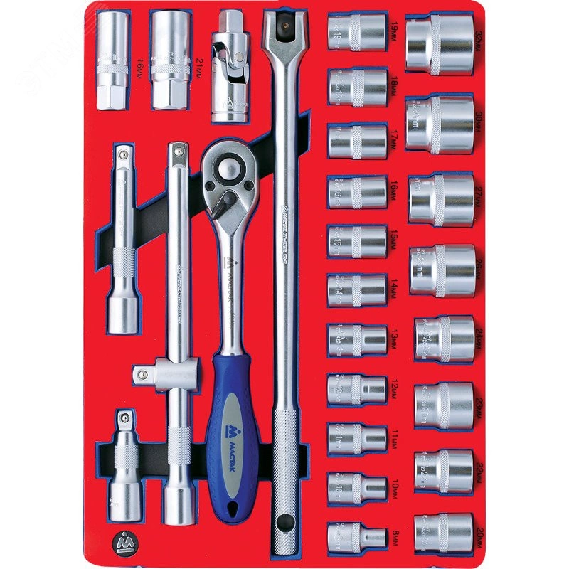 Набор инструментов 28 предметов торцевые головки с присоединительным квадратом 1/2 дюйма и аксессуары 5-004028 в ложементе из материала EVAПредназначен для комплектации передвижных инструментальных тележек или слесарных верстаков при создании индивидуальных рабочих мест на станциях технического обслуживания автомобилей и других предприятиях, занимающихся обслуживанием и ремонтом различной техники.