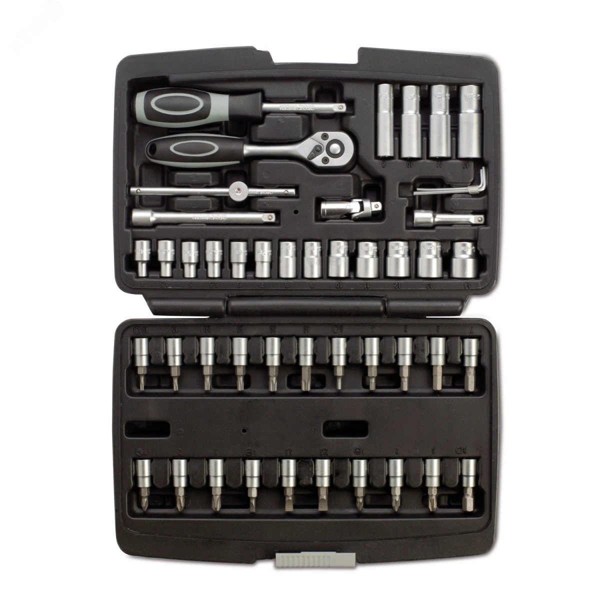 Набор торцевых головок из 47 предметов. Хромованадиевая сталь, промышленное качество, пластиковый чемодан черного цвета, приводной механизм 1/4 дюйма. Комплектация: торцевые головки 4-4,5-5-5,5-6-7-8-9-10-11-12-13-14 мм, удлинённые головки 8,10,11,13 мм, реверсивный ключ с трещоткой, отвёрточная рукоятка, 2 удлинителя 50 и 100 мм, скользящая Т-образная рукоятка 115 мм, карданный шарнир, биты: PH 1-2-3, PZ 1-2-3, Шлиц 4-4,5-6,5, шестигранник 3-4-5-6-8 мм, биты Torx T10-T15-T20-T25-T30-T40, шестигранные ключи 1,5-2-2,5мм.