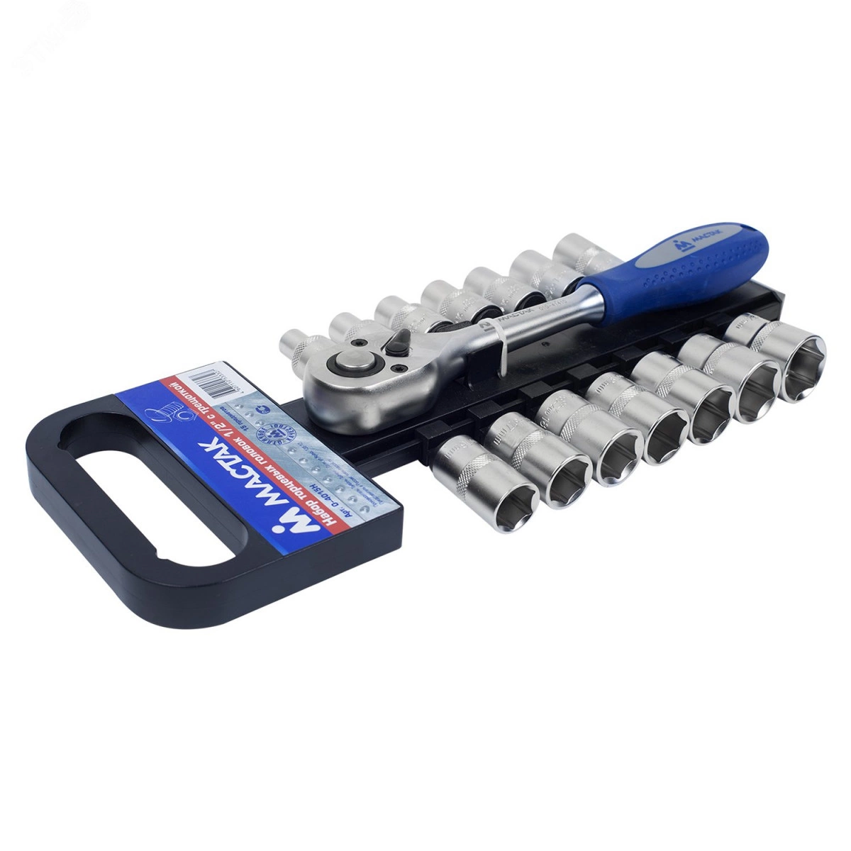 Набор фирмы формата 1/2''Предназначен для работ со средним крепежом. Головки изготовлены из инструментальной хромванадиевой стали, на ободке головок нанесена специальная насечка, исключающая проскальзывание руки во время работы. Трещотка, входящая в состав набора - выполнена в классическом варианте – флажок переключения реверса, кнопка фиксации и сброса головок. Рукоятка трещотки изготовлена из двухкомпонентных. Материалов, не подверженных воздействию масел и бензина. На трещотку имеется в продаже ремонтный комплект. Набор поставляется на пластиковом держателе, удобном как для хранения, так и для транспортировки набора. Состав набора - Головка торцевая стандартная шестигранная 1/2'', серии 000-400 8, 10, 11, 12, 13, 14, 15, 16, 17, 18, 19, 21, 22, 24 мм. Трещотка 1/2'', флажковая с кнопкой серии 010-41410 45 зубцов, 250 мм.