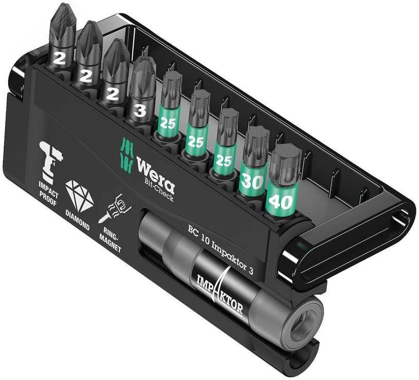 Набор в прочном футляре Bit-Check фирмы Wera. Наборы Bit-Check обеспечивают полный обзор всех размещённых инструментов. Лишние в работе биты просто возвращаются на свое место в футляре, чтобы не потерялись. Простая переноска, например, в кармане рубашки. Технология Impaktor обеспечивает срок службы инструментов, заметно превышающий средние показатели даже с учетом жестких условий их применения. Повышенное сопротивление трением за счёт шероховатого покрытия из алмазных частиц предотвращает выскальзывание наконечника из винта. Особенно подходят для работы с предлагаемыми на рынке ударными винтовертами. Держатель Impaktor Wera для смягчения максимальных импульсных скачков. Особый эффект за счёт наличия двух разных торсионных зон. С круглым магнитом для простой фиксации даже длинных и тяжелых винтов, идеально для работы в положении над головой. Магнит можно отвести назад, тем самым нейтрализовав его действие.