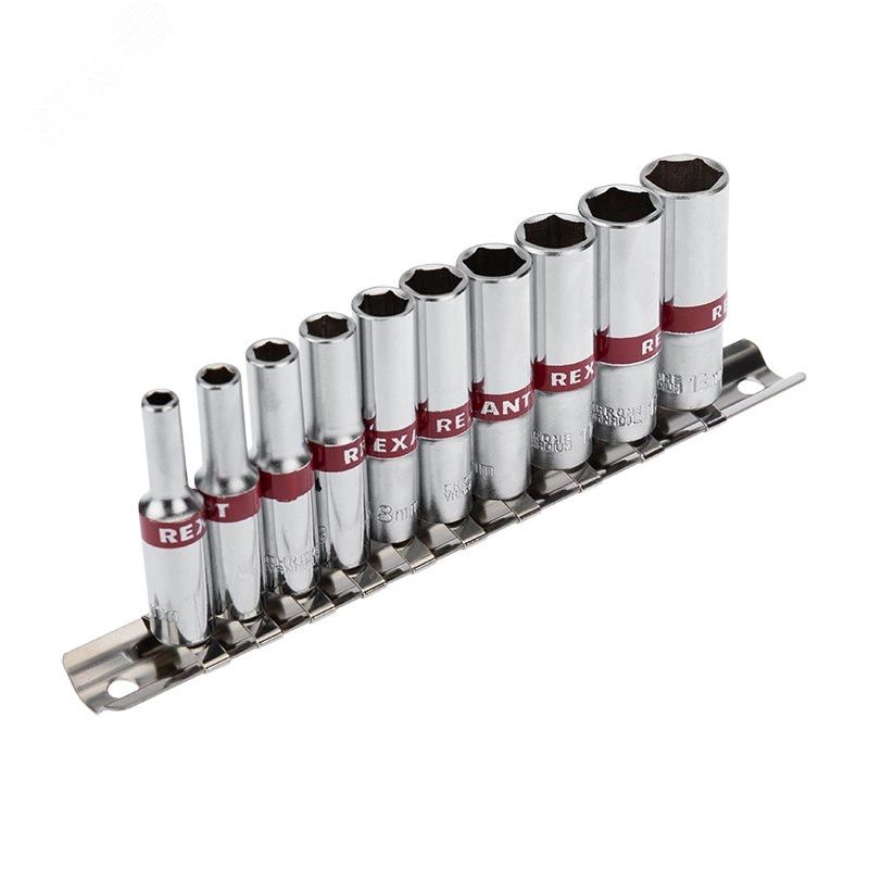 Набор головок REXANT используется для монтажа и демонтажа резьбовых соединений. Инструменты изготовлены из хромованадиевой износостойкой и долговечной стали с хромоникелевым покрытием. Твердость материала рабочей части головок – 42 HRС. В набор входят 6-гранные удлиненные торцевые головки на планке под квадрат 1/4' следующих размеров - 4, 5, 6, 7, 8, 9, 10, 11, 12 и 13 мм. Ярко-красная полоска предназначена для удобного поиска.