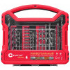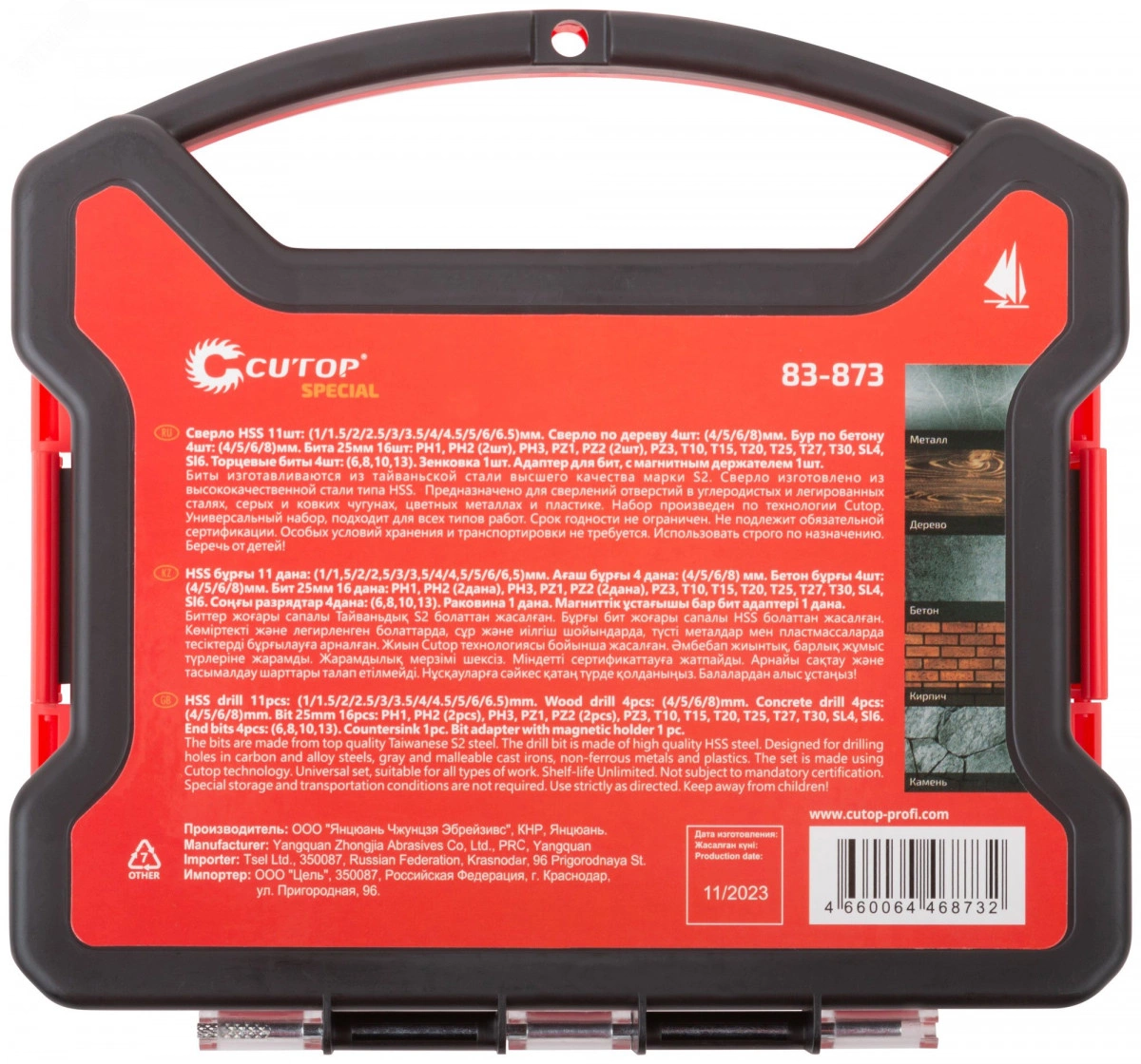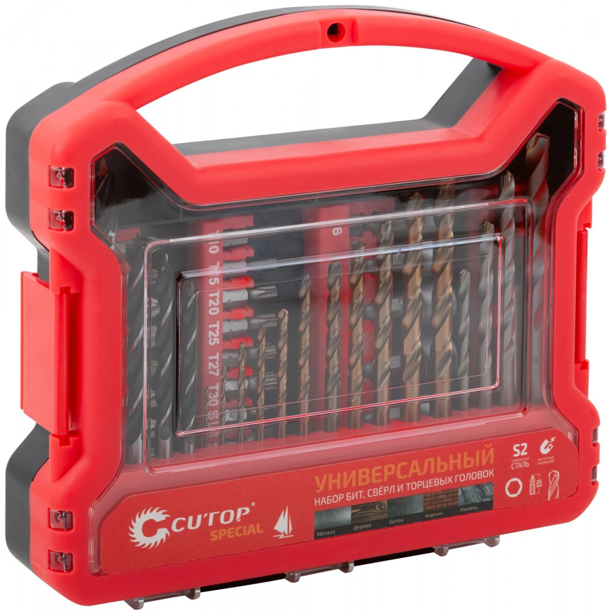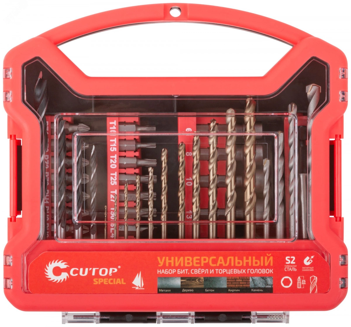 Универсальный набор бит и сверл Cutop Special, включающий в себя 41 предмет, подходит для всех типов работ. Биты произведены по технологии CUTOP, изготавливаются из тайваньской стали высшего качества марки S2. Ребра бит производятся с помощью холодной штамповки в соответствии с точной спецификацией. Шлицы проходят специальный процесс закалки при температурах до 870 градусов Цельсия — в результате их твердость достигает 60 HRC, что увеличивает срок службы оснастки. Сверла изготовлены из высококачественной стали типа HSS. Предназначены для сверлений отверстий в углеродистых и легированных сталях, серых и ковких чугунах, цветных металлах и пластике.
