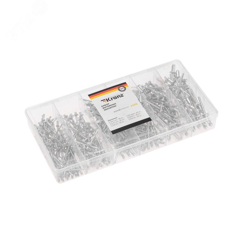 Вытяжные заклепки представляют собой крепежные изделия для механического соединения 2 и более деталей. Подходят для скрепления предметов из металла, древесины, пластмассы, кожи. Набор состоит из 320 заклепок, которые поставляются в пластиковом органайзере, позволяющем не только удобно хранить изделия, но и быстро находить необходимый размер.