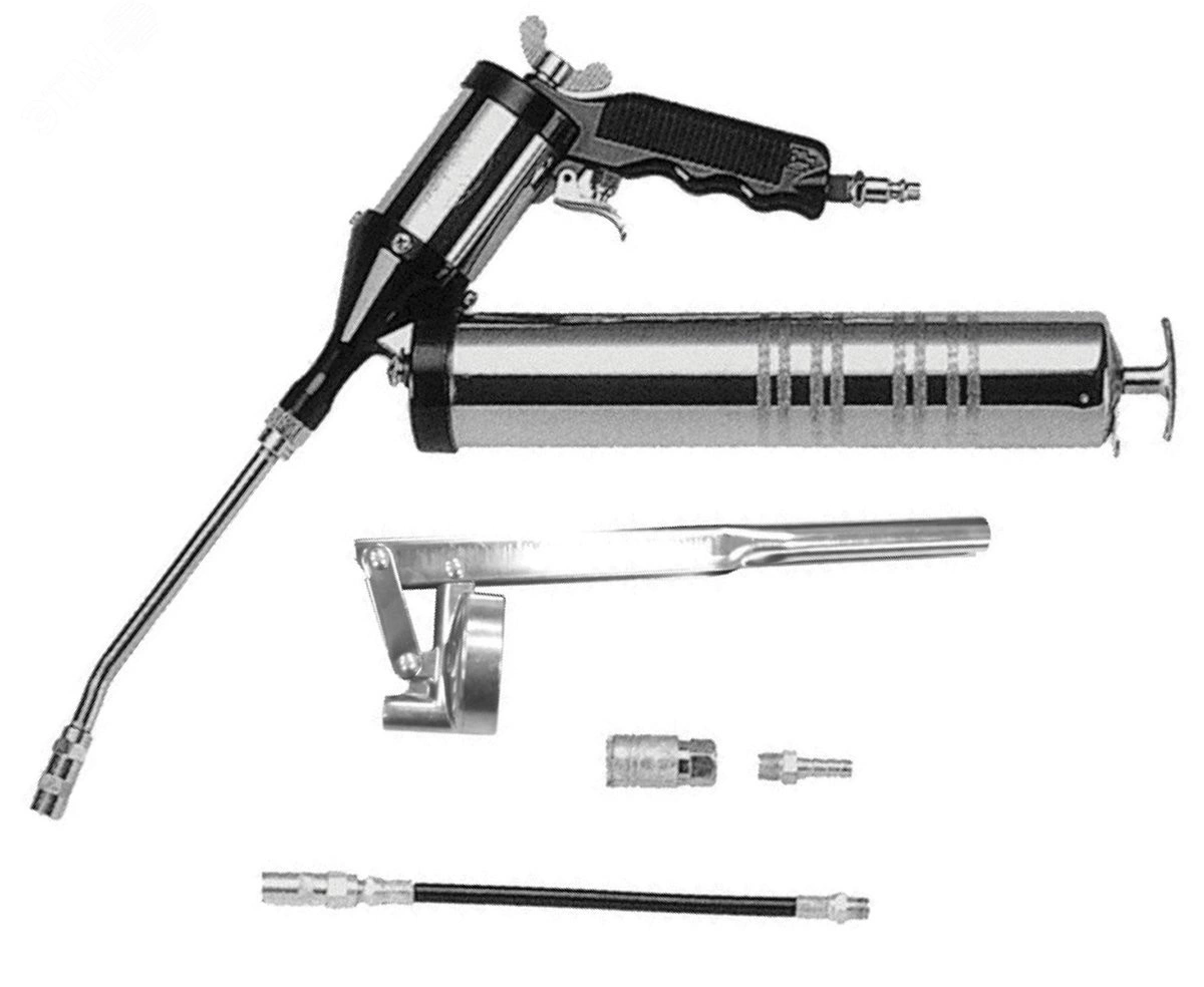 Нагнетатель консистентных смазок для работы в труднодоступных местах, с резервуаром, емкостью 400, применяется при производстве работ по техническому и регламентному обслуживанию узлов и агрегатов техники, имеющих точки смазки, снабженные пресс-масленками первого и второго типа всех номеров. Инструмент имеет узел, позволяющий перемещать резервуар относительно рукоятки на 360 град. Изделие поставляется в комплекте с дополнительными приспособлениями и, в случае отсутствия возможности подключения инструмента к воздушной магистрали - ручной рычажный привод. Пневматический смазочный шприц подает смазку в автоматическом режиме. При нажатии на клавишу куркового механизма начинается постоянная подача смазки, порционно в автоматическом режиме.