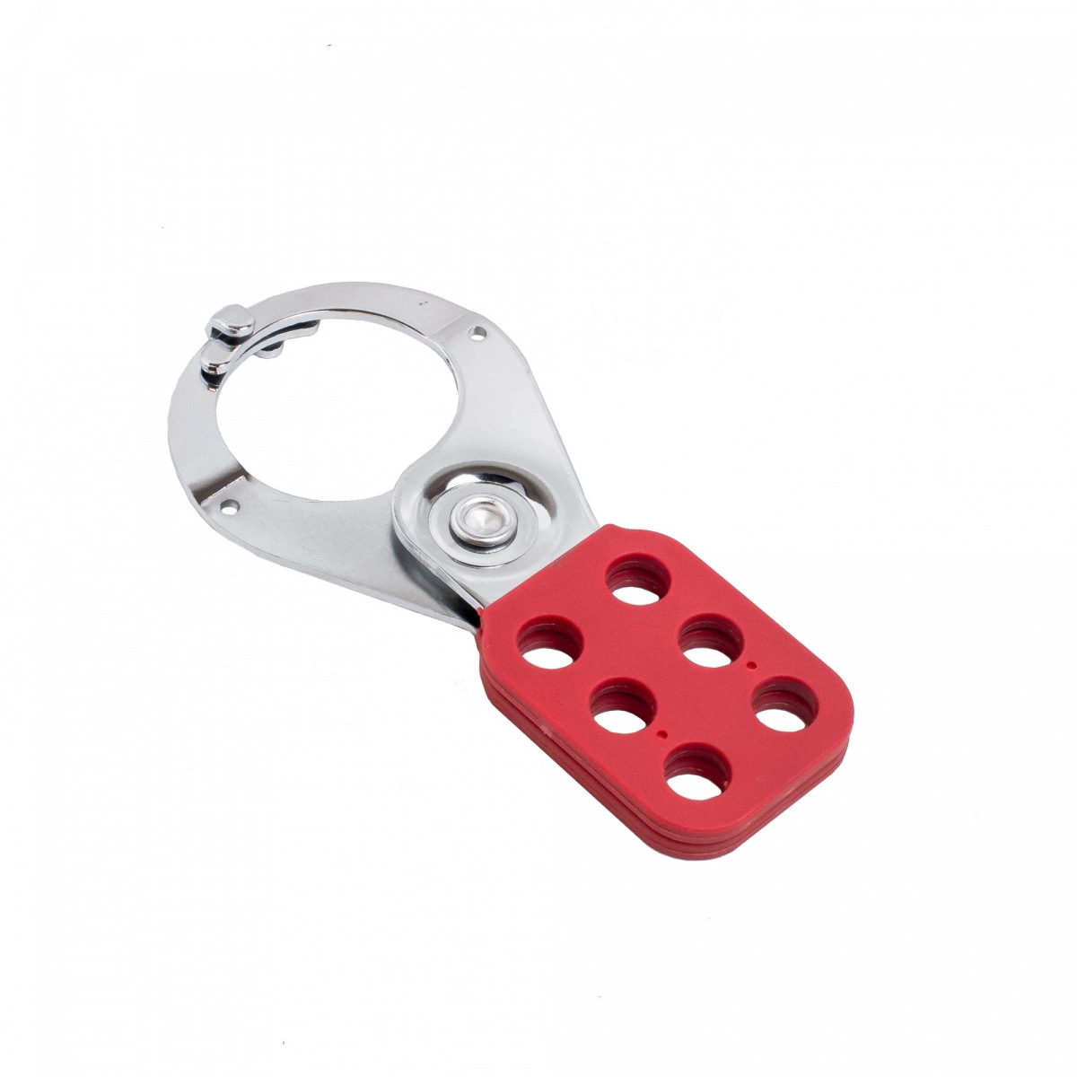 Накладка множительная с ограничителем затвора из оцинкованной стали и винилового покрытия. Диаметр зажимного кольца 38 мм. Рассчитана на 6 навесных замков (дужка не более 10,5 мм). Устойчива к УФ-лучам, химически агрессивным средам и температурам. Цвет винилового покрытия красный.