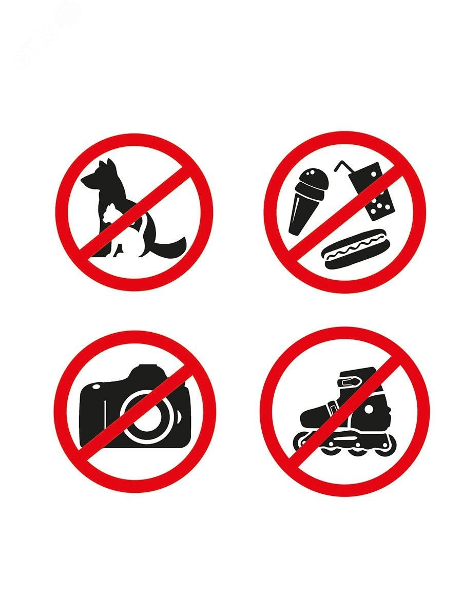 Набор запрещающих знаков состоит из 4 наклеек формата 'мини' 10х10 сантиметров каждая. В набор входят - 'Фотосъемка запрещена', 'На роликах не заходить', 'С продуктами питания вход запрещен', 'С животными вход запрещен'. Наклейки предназначены для размещения на входных дверях магазинов и прочих организаций и информируют о том, что на данной территории или объекте запрещено вести фото- и видеосъемку, находиться на роликовых коньках, находиться с продуктами питания в открытой упаковке, находиться с животными. В набор скомпанованы наклейки, необходимые для каждой организации, имеют одинаковый цвет и удобный размер. Знаки хорошо видны и сохраняют яркость цветов долгое время даже при постоянном использовании. Имеют хорошую устойчивость к смазыванию, стойкость к прямым солнечным лучам, перепадам температуры, мелким механическим воздействиям.