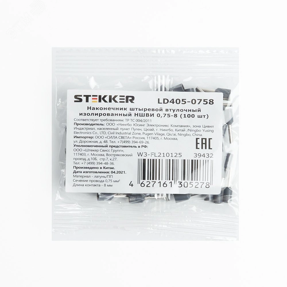 Наконечник штыревой втулочный изолированный НШВИ 0,75-8 (упаковка 100 шт), LD405-0758