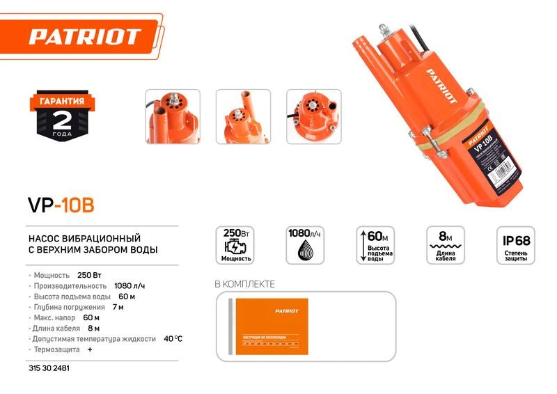 Насос погружной вибрационный VP 10В верхний забор 300Вт 18л/мин H-70м D-96мм термозащита PATRIOT 315302481