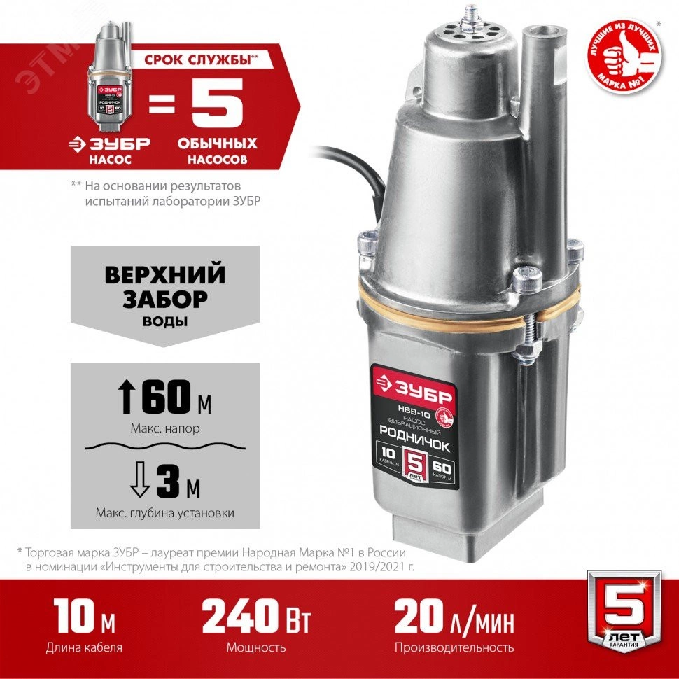 Полное описание: Насос вибрационный Родничок-В НВВ-10 ЗУБР, 10 м, верхний забор воды