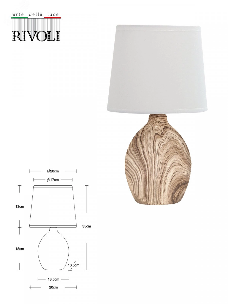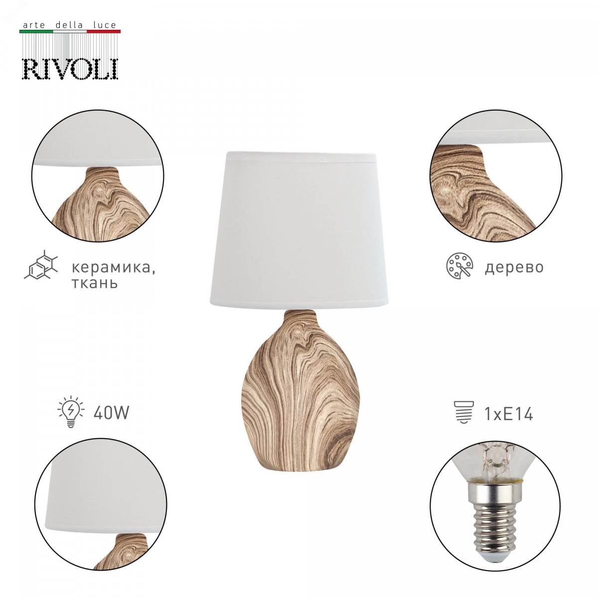 Rivoli Chimera (арт. 7072-503) - уютный и очень красивый дизайнерский светильник от итальянского бренда. Основание настольной лампы изготовлено из керамики теплого цвета светлое дерево. Абажур выполнен из специальной ткани с повышенной прочностью и защитой от накопления пыли. Белый абажур классической формы отлично рассеивает свет и создает в комнате благоприятную для отдыха атмосферу.
