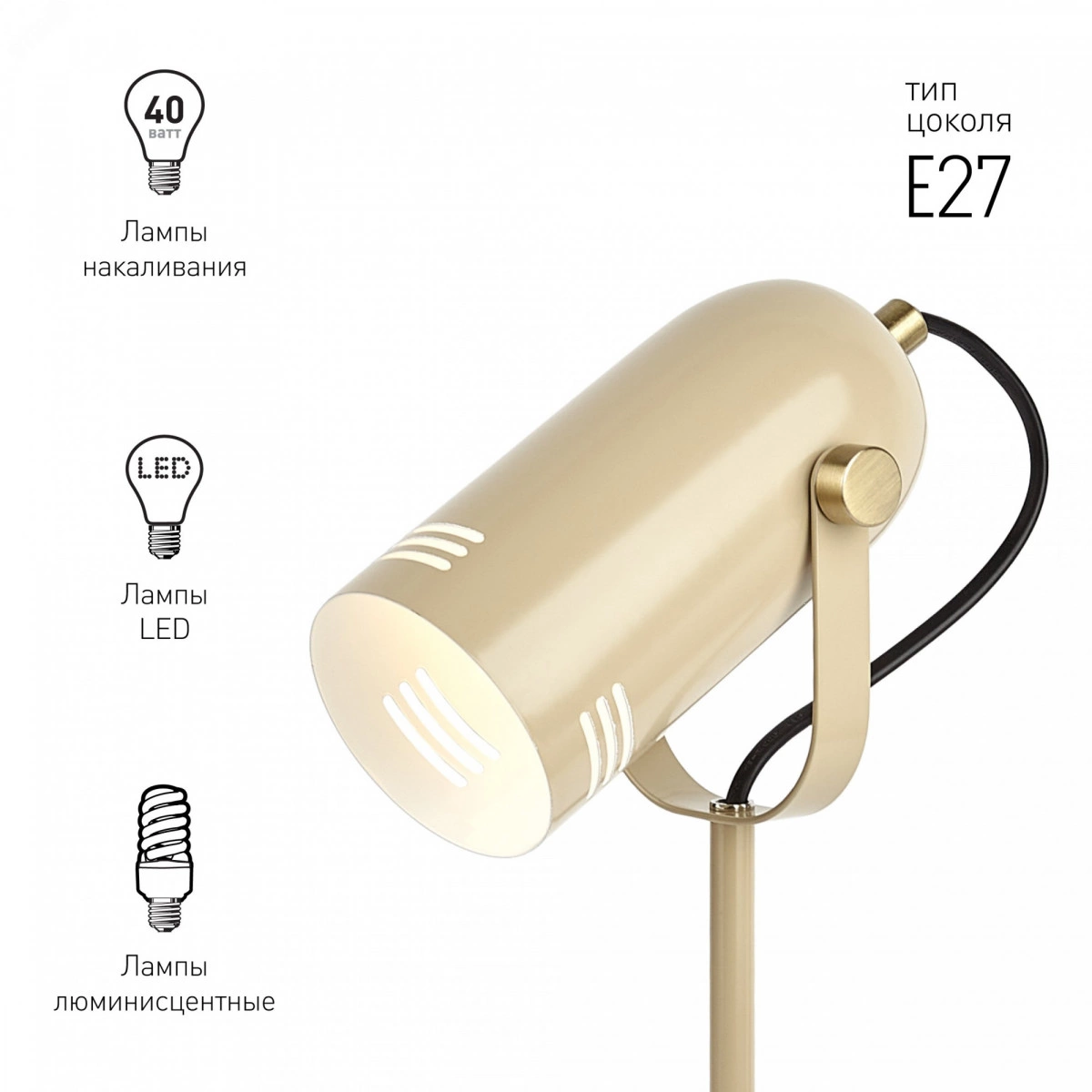 Красивый и удобный настольный светильник ЭРА N-117-Е27-40W-BG в стильном `ретро` корпусе. Может использоваться с разными источниками света - лампой накаливания, компактной люминесцентной лампой (КЛЛ) или светодиодной (LED) лампой. Прочный металлический корпус украшен гальванизированными элементами. Подвижный плафон позволяет регулировать направление света. В числе преимуществ для комфортного использования - устойчивость конструкции и оптимальные размеры для размещения на столе. Трендовый дизайн и актуальное сочетание цветов (бежевый корпус с матовыми золотистыми деталями) сделают этот светильник изюминкой интерьеров, особенно в стиле лофт или минимализм.