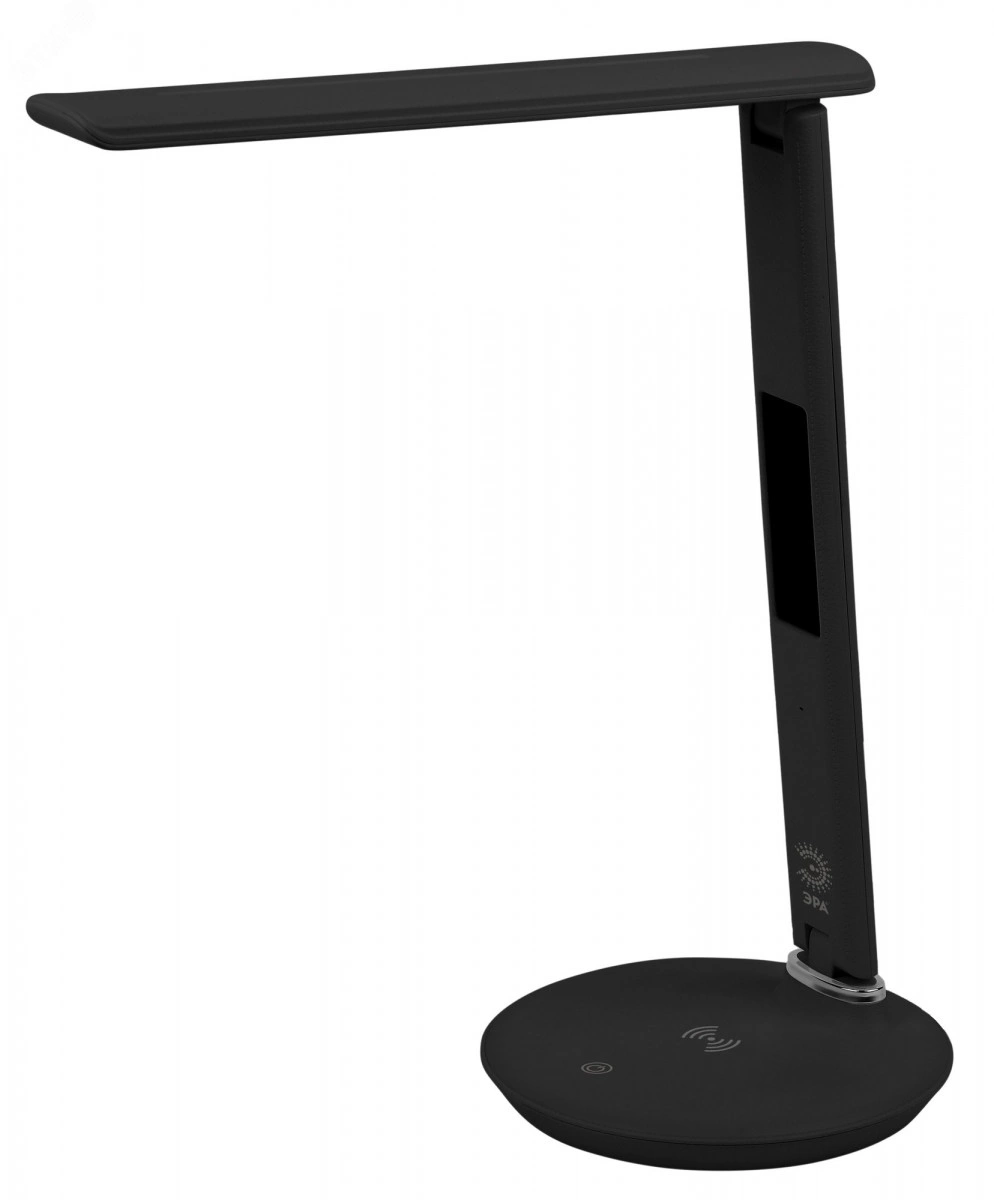 Настольный светильник ЭРА NLED-505-10W-BK со светодиодами (LED) в качестве источников света в дизайне `под кожу`. Удобная складная конструкция с сенсорным управлением, возможностью выбора цветовой температуры и плавным диммером для регулировки яркости. На основании светильника расположен встроенный модуль Qi для беспроводной зарядки мобильных устройств. Просто положите телефон, поддерживающий функцию Qi на основание светильника в отмеченной зоне - светильник подзарядит его. Главное преимущество светильника - многофункциональный дисплей с функциями часов, будильника, календаря и термометра.