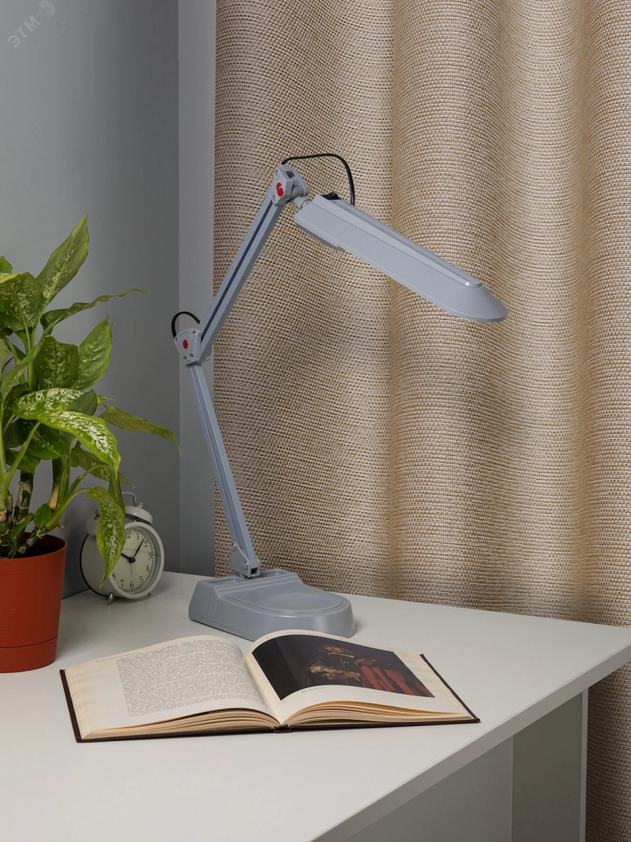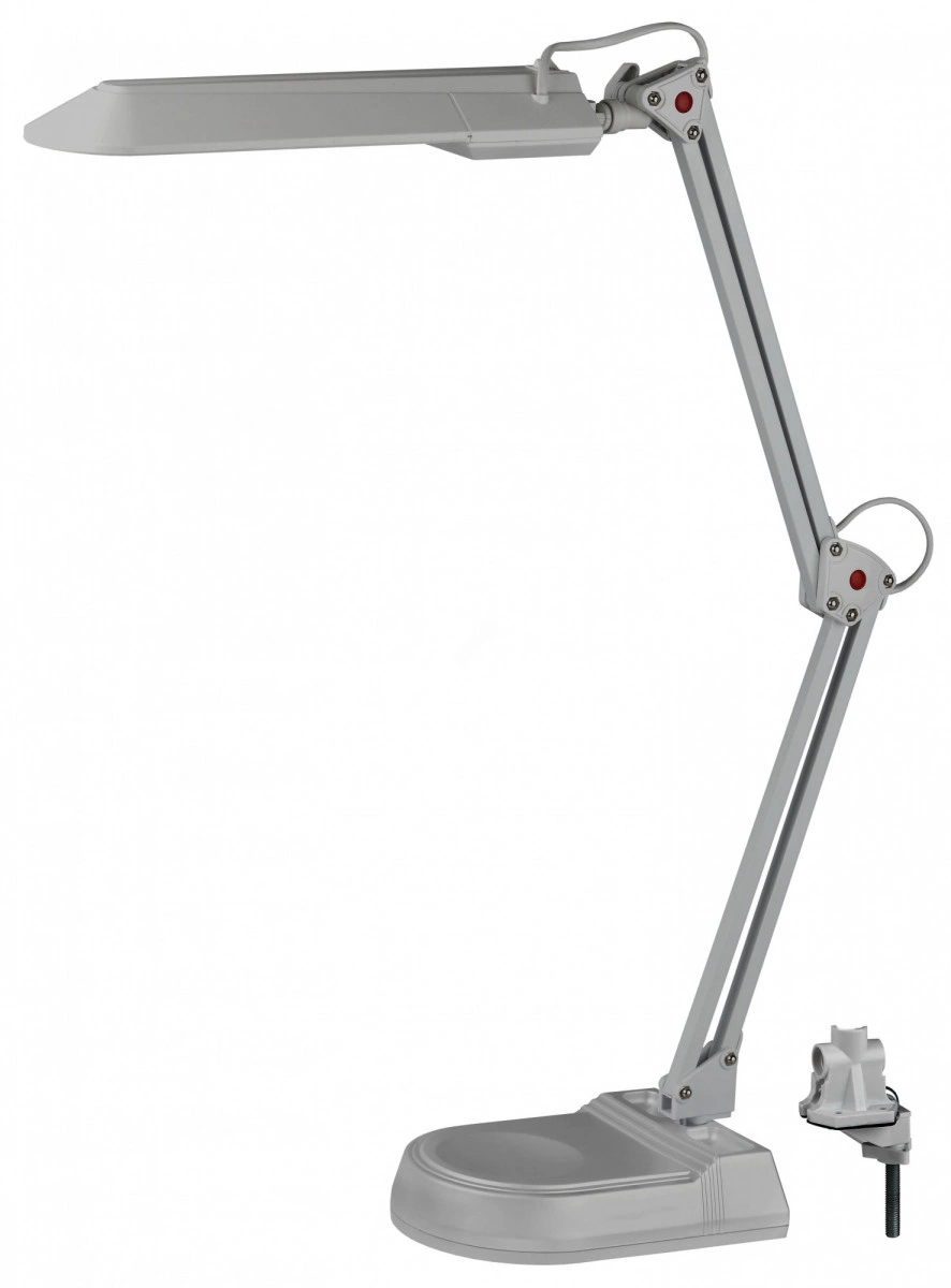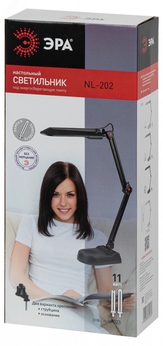 Светильник предназначен для использования с энергосберегающей лампой, которая обеспечивает экономию электроэнергии до 70%. Лампа входит к комплект. Выключатель на основании плафона. Два варианта крепления в комплекте: основание, струбцина.Высота плафона регулируется двухсекционной сгибающейся стойкой, направление света регулируется поворотом плафона в любом направлении под любым углом.Как и все светильники ЭРА с лампой PL, модель укомплектована ЭПРА (электронным пускорегулирующим аппаратом), обеспечивающим ровный свет без мерцания.Предназначен для использования с энергосберегающей люминесцентной лампой, имеющей следующие характеристики: мощность 11W, цоколь G23, 220V 50HZ, лампа в комплекте.