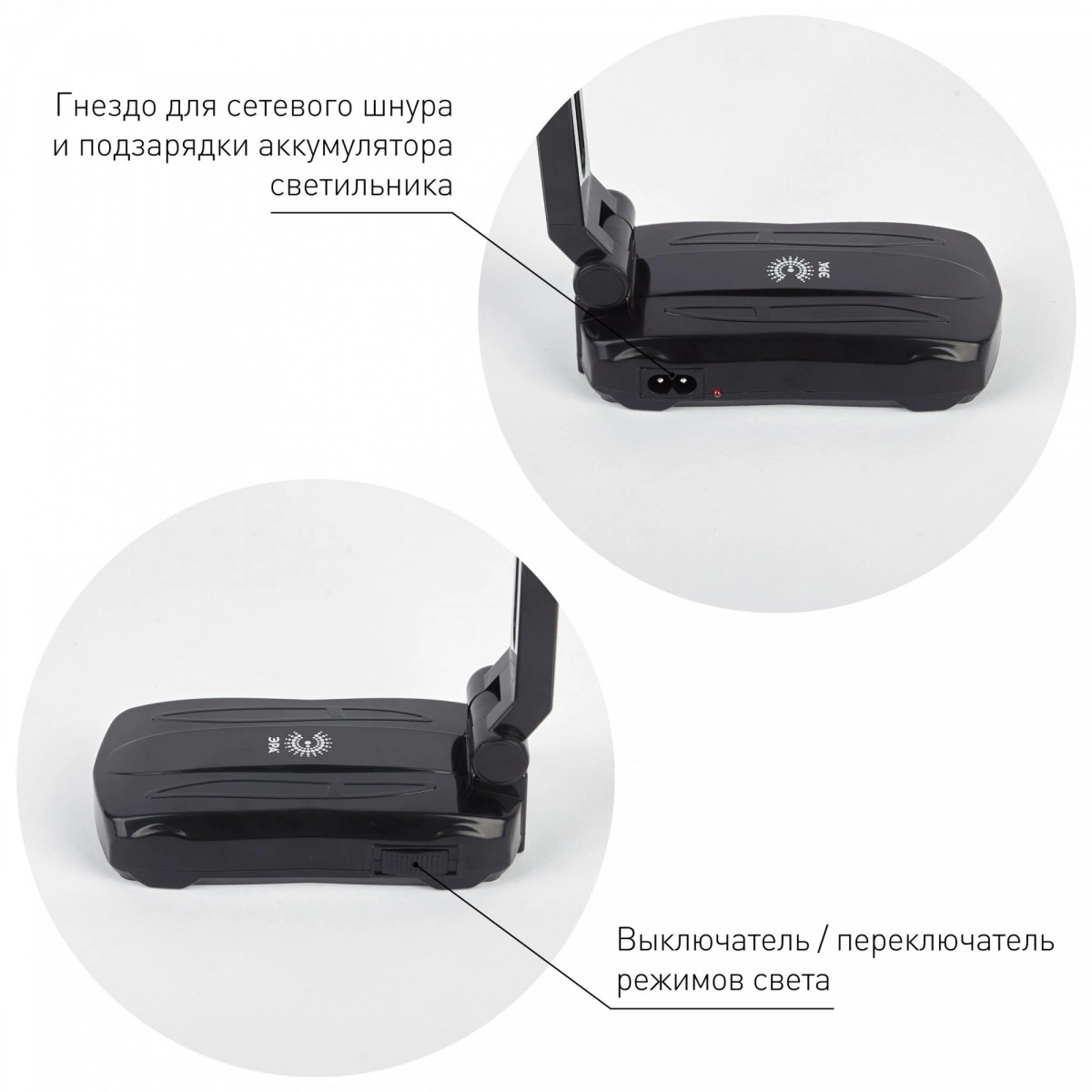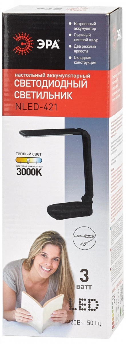 Настольный аккумуляторный светодиодный светильник ЭРА NLED-421-3W-BK обеспечивает теплый яркий свет, аналогичный свету лампы накаливания. Специально подобранные светодиоды создают привычное мягкое освещение. Аккумулятор обеспечивает автономную работу до 4 часов, в зависимости от режима. Можно выбрать максимальная яркость или приглушенный свет. Съемный сетевой шнур в комплекте, устойчивое основание. На основании есть отверстия для подвеса на стену. ВНИМАНИЕ! Не оставляйте светильник постоянно подключенным к сети во избежание выхода аккумулятора из строя. Время зарядки - не более 12 ч. После полной зарядки используйте светильник в автономном режиме не менее 2 часов! Если аккумулятор полностью разряжен, светильник не включается, его необходимо заряжать не менее 12 часов в выключенном состоянии.