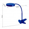Настольный светильник ЭРА NLED-435-4W-BU со светодиодами (LED) в качестве источников света с прищепкой и длинной гибкой стойкой. Выключатель на плафоне (панели со светодиодами). Направление света регулируется поворотом плафона в любом направлении под любым углом.