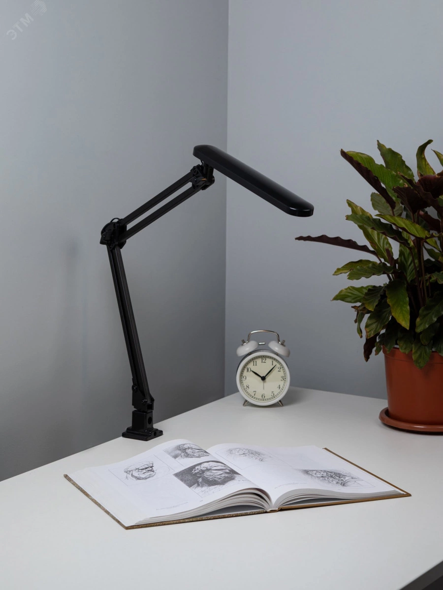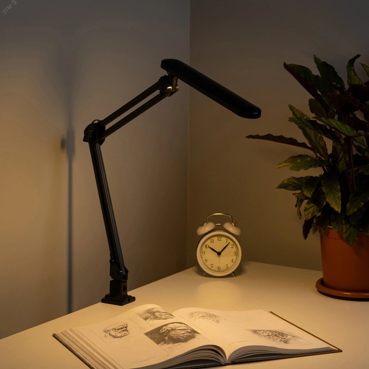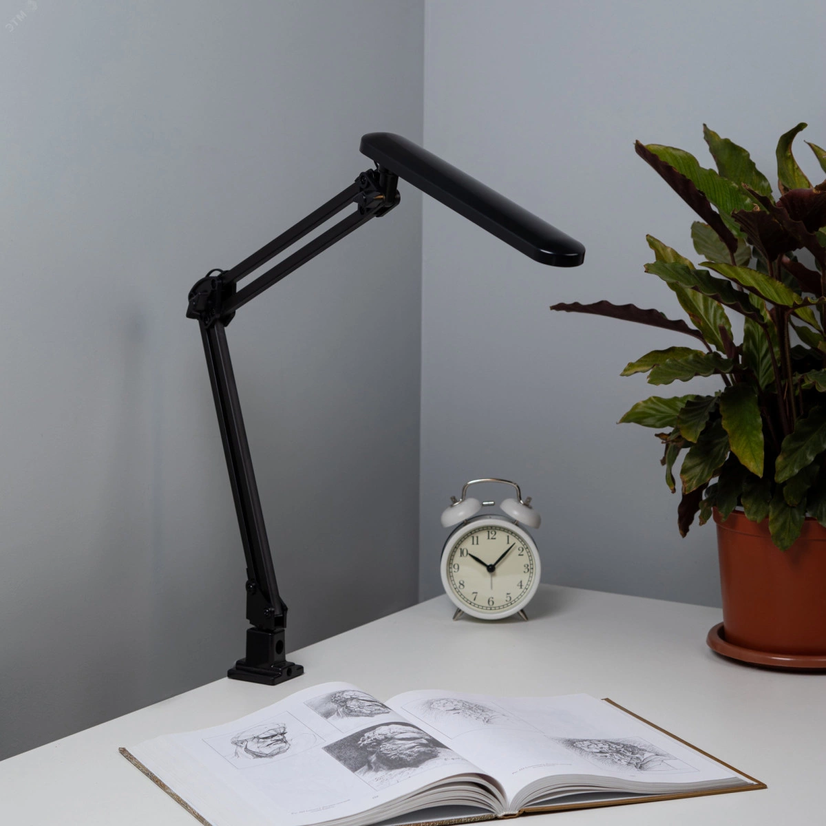 Настольный светильник ЭРА NLED-441-7W-BK со светодиодами (LED) в качестве источников света. Выключатель на плафоне. Высота плафона регулируется двухсекционной сгибающейся стойкой. Удобное крепление на струбцину к любой плоской поверхности.