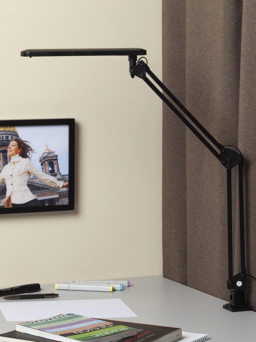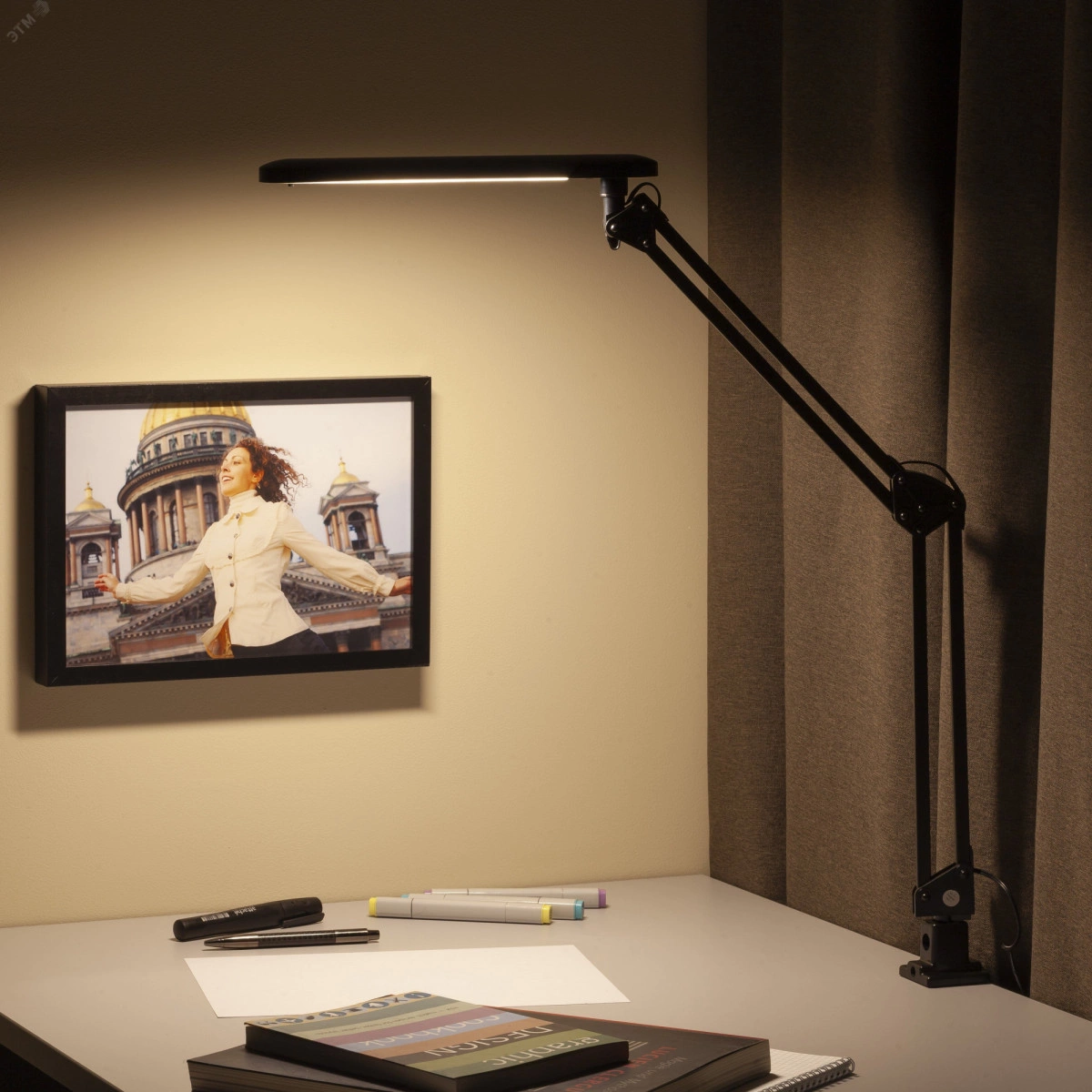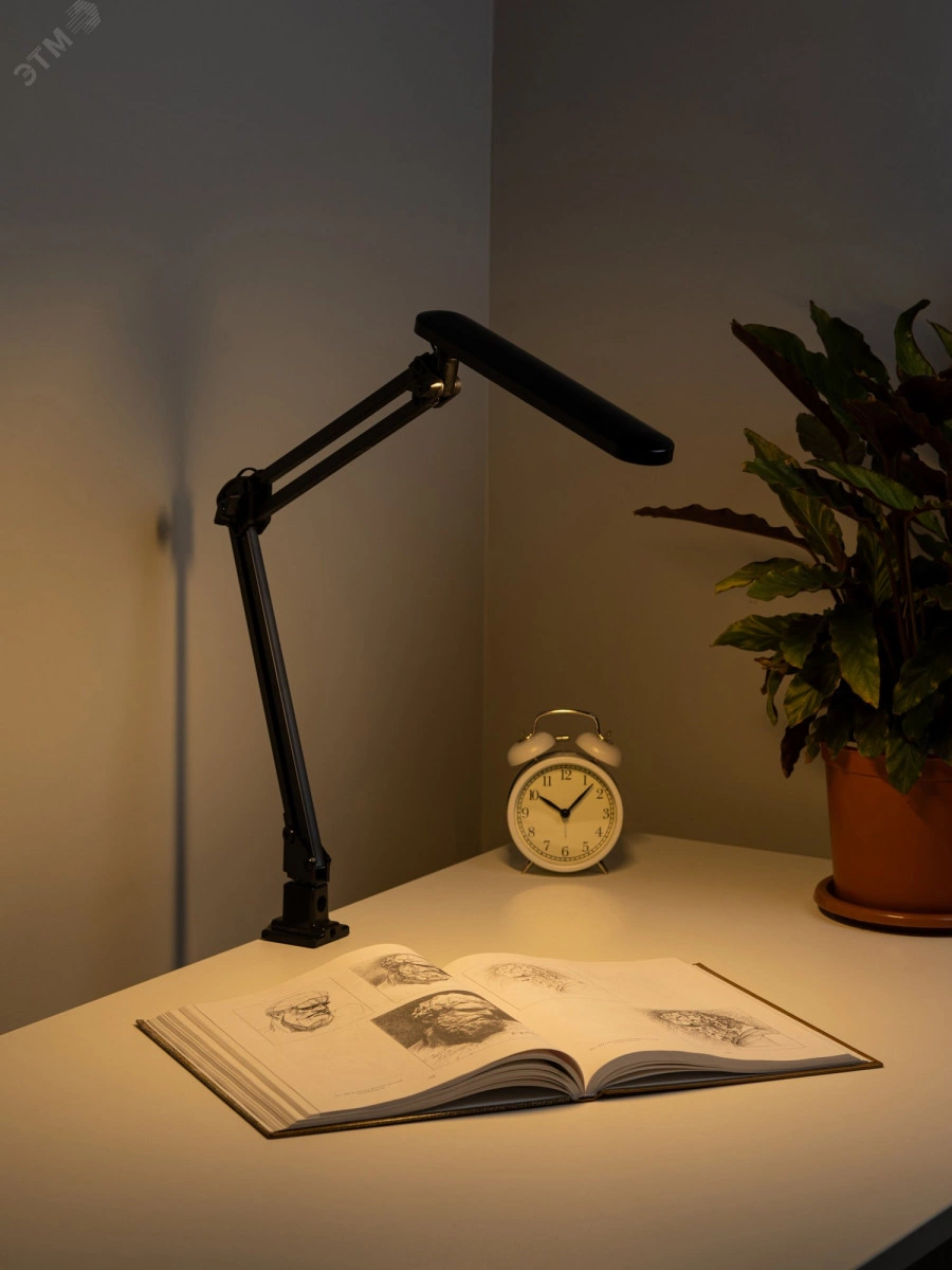 Настольный светильник ЭРА NLED-441-7W-BK со светодиодами (LED) в качестве источников света. Выключатель на плафоне. Высота плафона регулируется двухсекционной сгибающейся стойкой. Удобное крепление на струбцину к любой плоской поверхности.