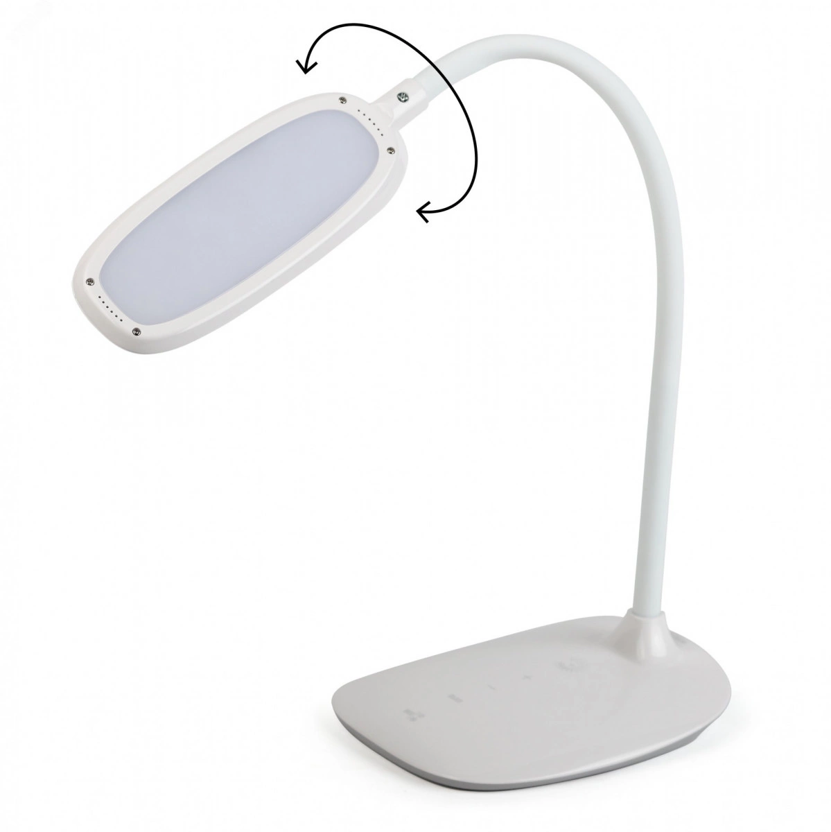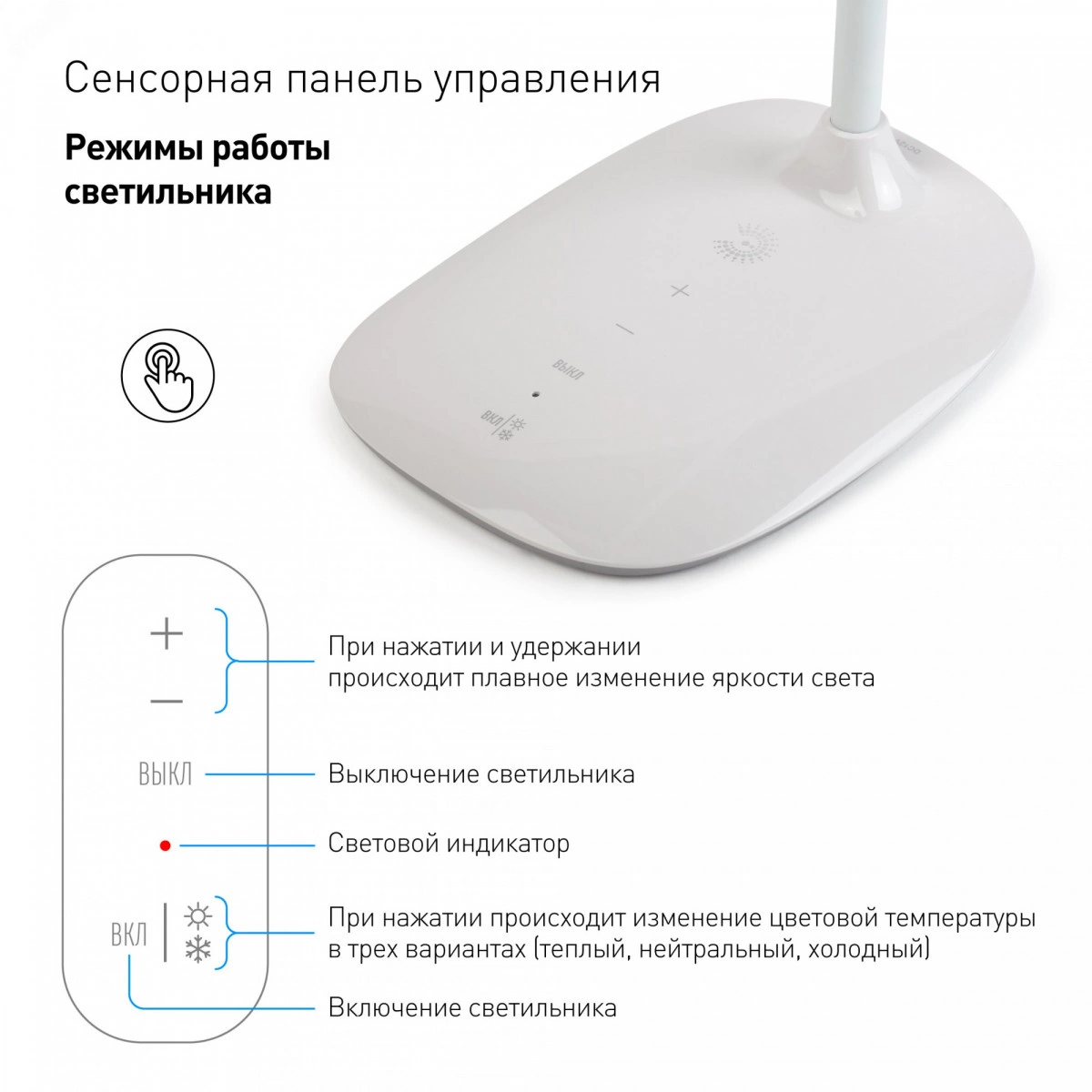 Настольный светильник ЭРА NLED-453-9W-W со светодиодами (LED) в качестве источников света. Оснащен сенсорным управлением, возможностью выбора цветовой температуры (теплый, нейтральный или холодный свет). Есть регулировка яркости освещения, 5 уровней. Удобный выбор направления света - наклон и поворот плафона в любом направлении. Актуальный и в то же время лаконичный дизайн, устойчивое основание обтекаемой формы.