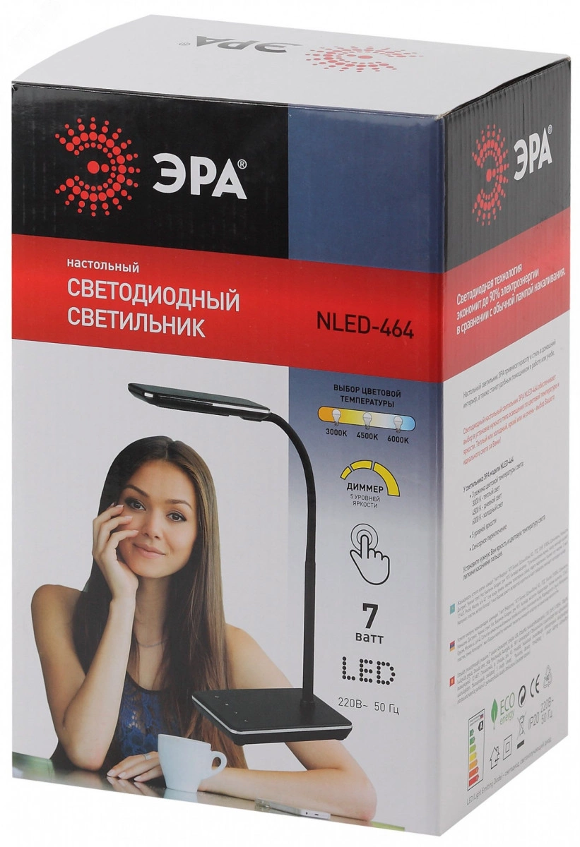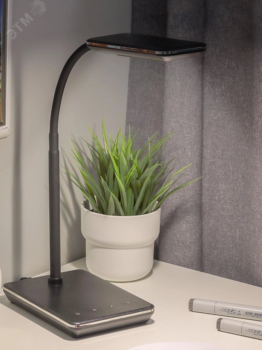 Настольный светильник ЭРА NLED-464-7W-BK выглядит необычно и стильно. Покрытие основания и плафона имитирует кожу, софт-тач стойка приятна на ощупь и имеет гибкую верхнюю часть, что позволяет легко менять направление света. Управление всеми функциями происходит при помощи сенсорных кнопок. В зависимости от ситуации можно выбирать нужный из трех вариантов температуры света: теплый свет для создания уютной атмосферы, отдыха или подготовки ко сну (режим ночника), базовый дневной свет для учебы или работы за столом, холодный свет для улучшения работоспособности. Выберите любой из пяти режимов яркости - плавный диммер управляется легкими касаниями пальцев.