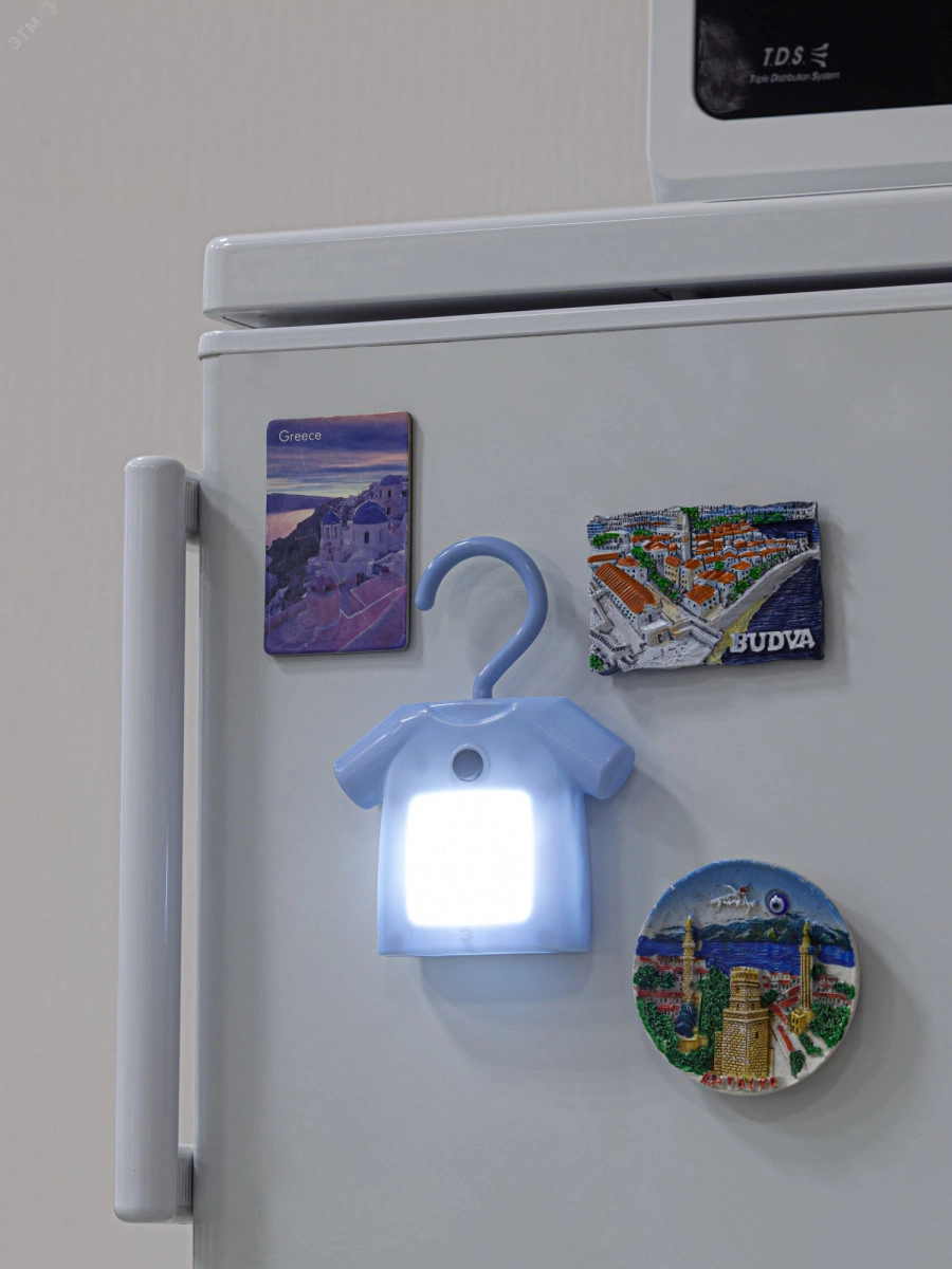 Удобный, красивый и функциональный светильник-ночник NLED-485-1W-SW-BU со светодиодами (LED), с выключателем. Дизайн корпуса ночника напоминает рубашку на вешалке. Светильник автономный, работает от элементов питания 3 х ААА (не входят в комплект поставки), у него есть крючок для подвеса с поворотом в любом направлении. Есть магнитное крепление - на металлических поверхностях держится без крюка. Также светильник-ночник можно просто поставить - будет устойчиво стоять. Используйте его где удобно - можно повесить в шкаф для подсветки, в любое другое подходящее место, просто поставить и даже прикрепить на холодильник. Поменять батарейки очень легко. Поставляется в блистерной упаковке с евроотверстием.