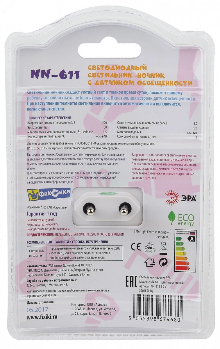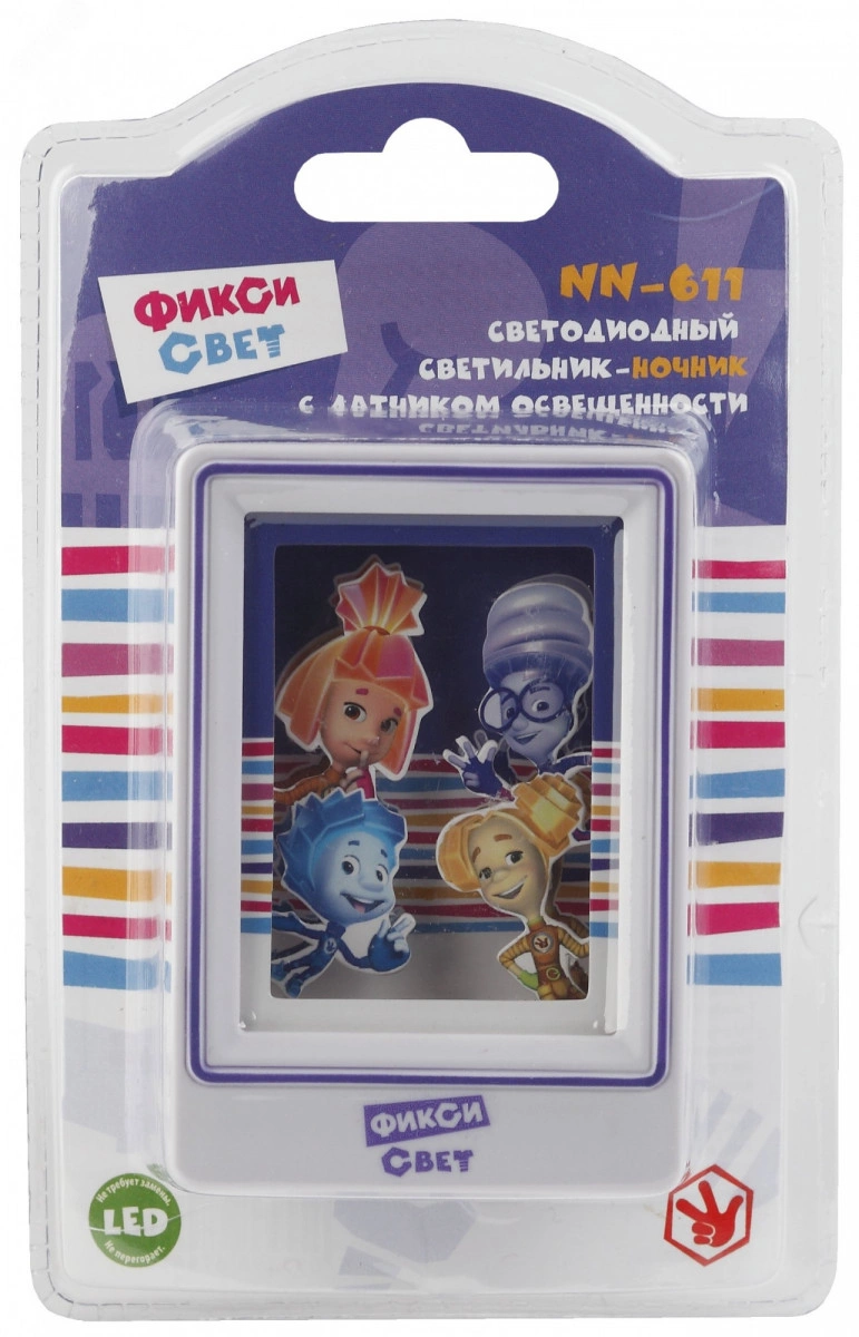 Светодиодный ночник с сенсором света. Часть лицензированной серии ''Фиксики''. За прозрачным ''экраном'' ночника - любимые детьми и взрослыми герои популярного современного мультфильма. Максимально удобное устройство! Этот ночник включается автоматически, как только в помещении становится темно. И выключается, когда наступает утро или в комнате включают основное освещение. Просто воткните компактный ЭРА NN-611-LS-V в розетку - все остальное он будет ответственно выполнять сам!
