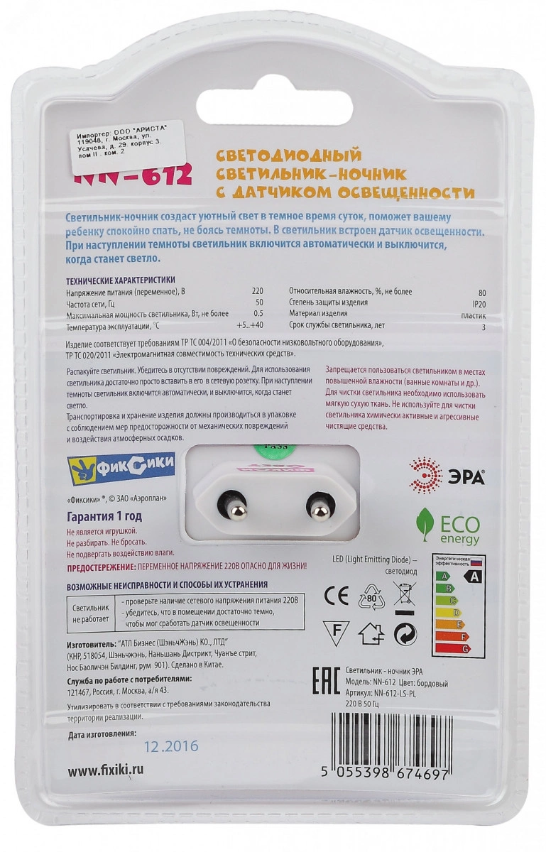 Светодиодный ночник с сенсором света. Часть лицензированной серии `Фиксики`. За прозрачным `экраном` ночника - любимые детьми и взрослыми герои популярного современного мультфильма. Максимально удобное устройство! Этот ночник включается автоматически, как только в помещении становится темно. И выключается, когда наступает утро или в комнате включают основное освещение. Просто воткните компактный ЭРА NN-612-LS-PL в розетку - все остальное он будет ответственно выполнять сам!