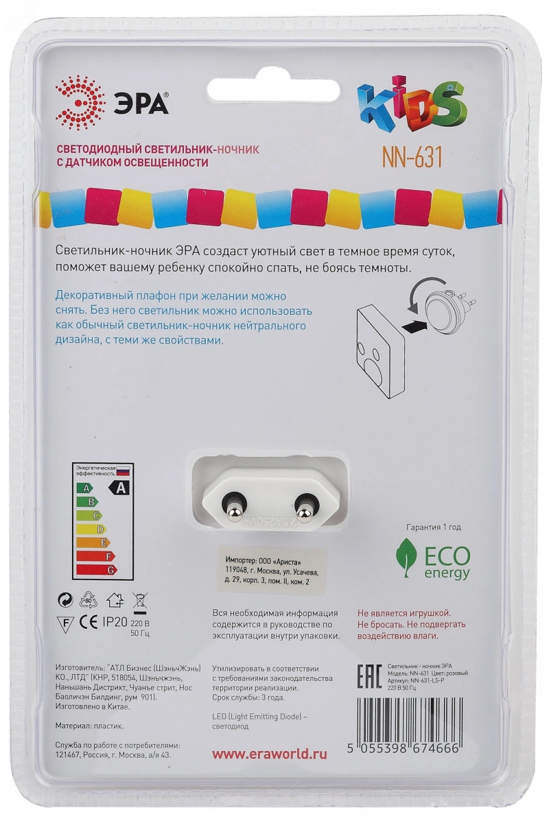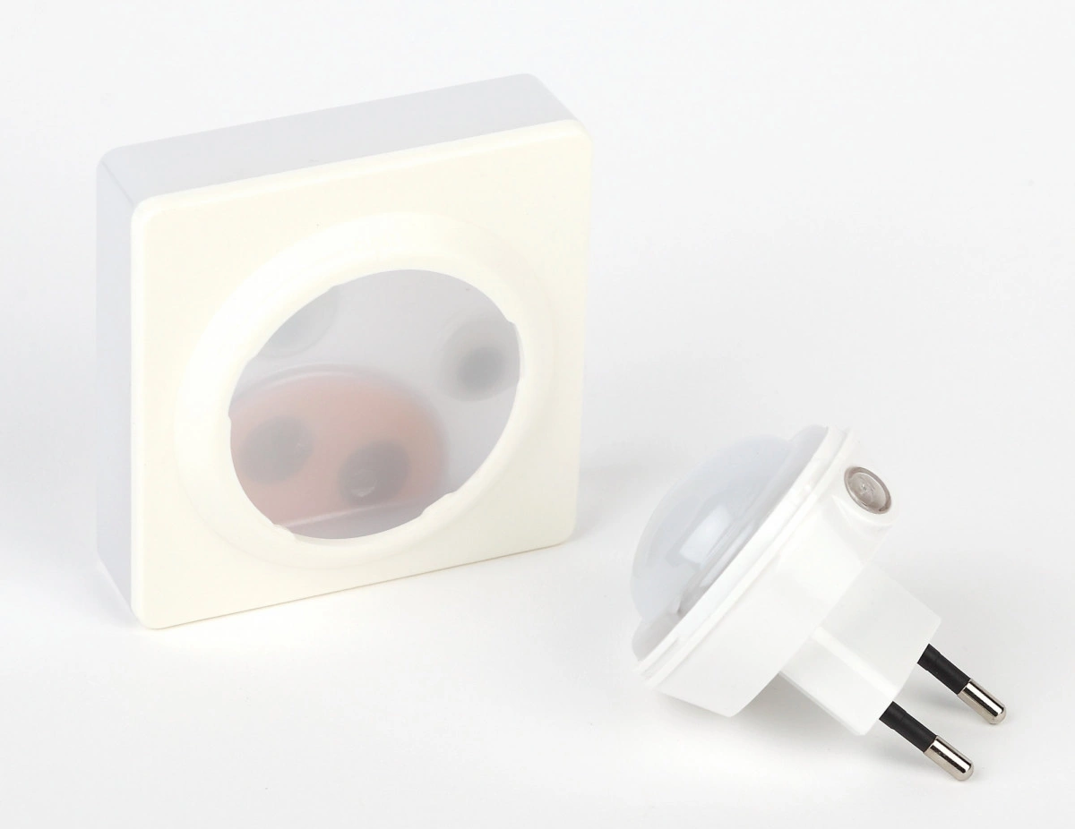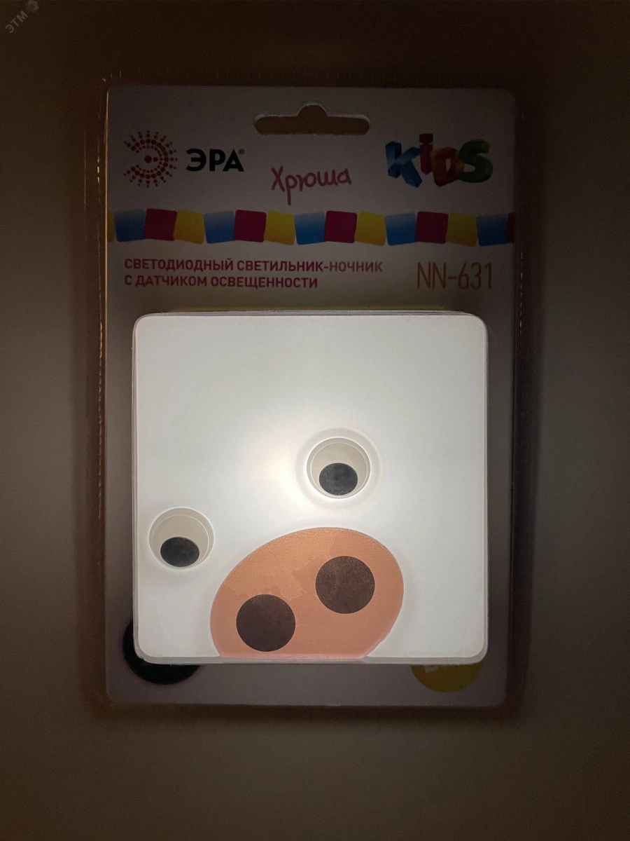 Ночник со светодиодами (LED) в качестве источников света и встроенным датчиком освещенности имеет съемную бикомпонентную насадку в виде цветной фигурки ''Хрюша''. Можно использовать без насадки, так получается ночник в нейтральном дизайне (белый корпус). Этот ночник включается автоматически, как только в помещении становится темно. И выключается, когда наступает утро или в комнате включают основное освещение. Просто воткните компактный ЭРА NN-631-LS-P в розетку - все остальное он будет ответственно выполнять сам! Современная LED-технология исключает пульсации света, освещение ровное и приглушенное - то, что нужно для комфортного сна или ночной подсветки. Упаковка позволяет проверить работу ночника не доставая его из блистера, нужно только включить его в розетку и прикрыть датчик освещенности рукой.