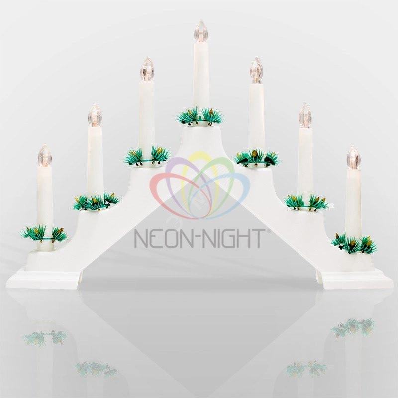 Новогодняя горка белого цвета с 7 свечками — великолепное дополнение к оформлению праздничного стола или декоративной композиции, а также отличный подарок для родных и друзей на любой из зимних праздников. Композиция состоит из 7 белых свечей, украшенных хвойными мини-венками, на Л-образной подставке. 7 экономичных ярких светодиодов излучают теплый белый свет. Для подключения к электросети предусмотрен 2-метровый кабель, длина которого позволяет разместить горку в любом удобном месте без использования удлинителя.