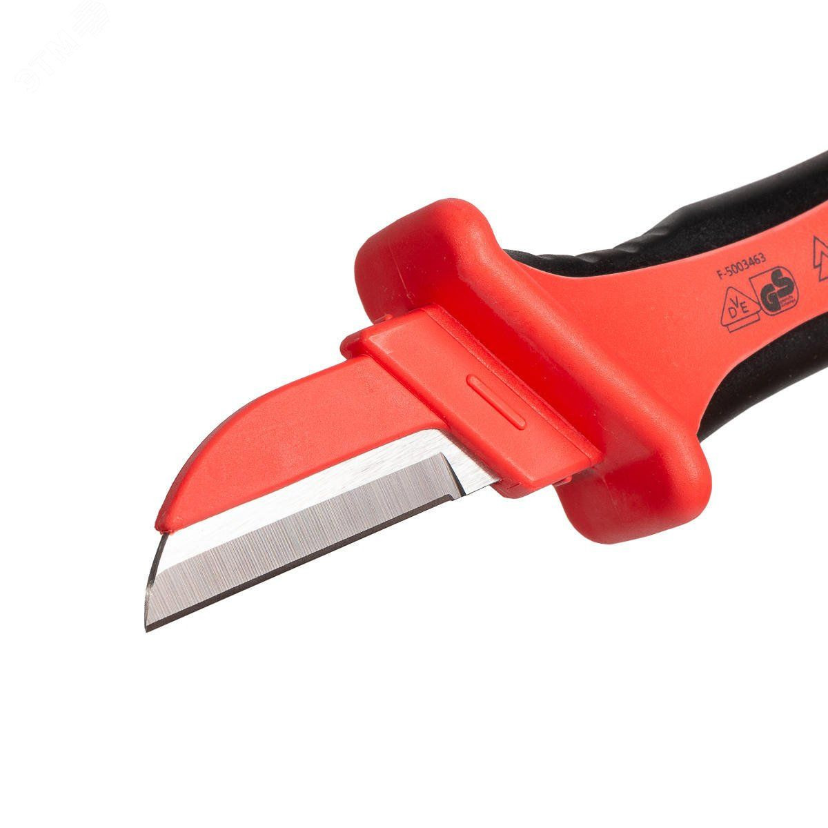 Для работы под напряжением до 1000 В. Прямое, частично изолированное лезвие для защиты от короткого замыкания. Лезвие из японской нержавеющей стали. Твердость лезвия HRC 51-53. Изолированная рукоятка с упором для пальцев. Двухкомпонентная рукоятка из нескользящей термопластрезины. Защитный чехол для безопасного хранения и транспортировки. Зачистка жил от окисной пленки, снятие оболочки и изоляции кабеля. Вес - 110 г. Длина - 195 мм