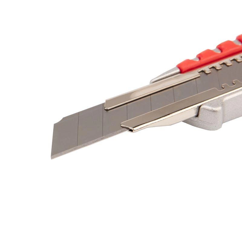 Корпус ножа металлический с обрезиненной рукояткой, что позволяет прикладывать значительное усилие при резке и обеспечивает долгий срок службы.