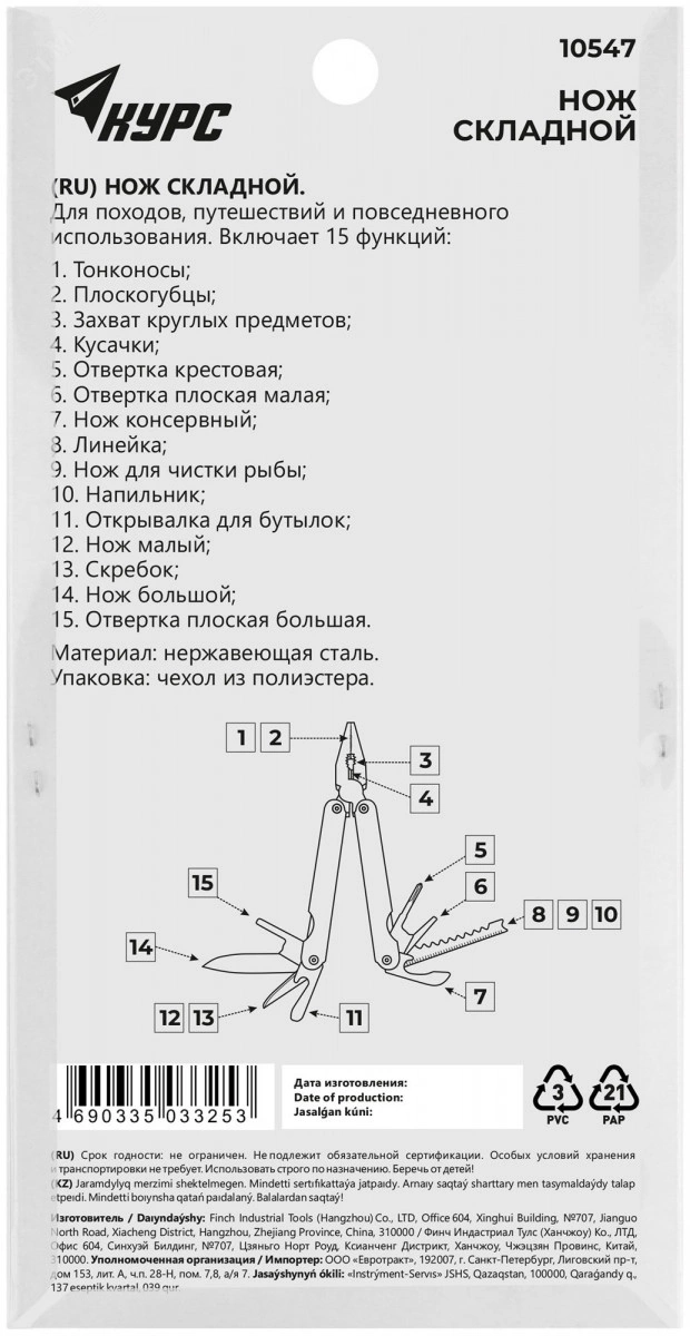 Многофункциональный. Для походов, путешествий и повседневного использования. Материал: нержавеющая сталь. Упаковка: нейлоновый чехол в блистере.