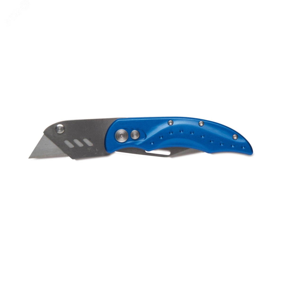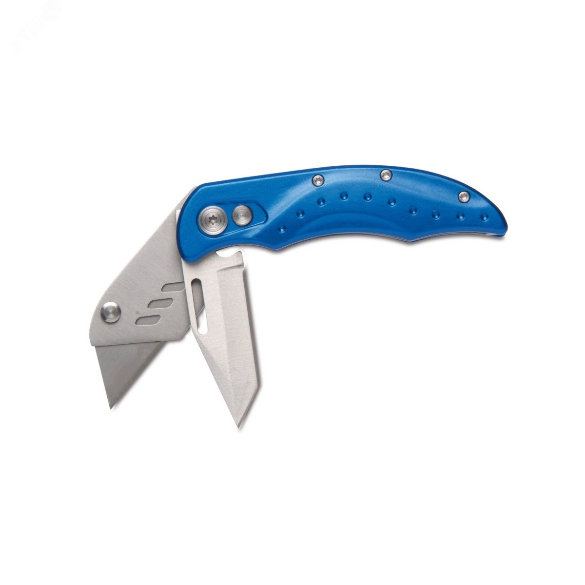 Многофункциональный нож с двумя лезвиями: трапециевидное сменное и клинковое лезвие длиной 60 мм. Быстрое переключение с одного лезвия на другое, предохранитель для открывания и закрывания лезвий, задний крючок для крепления к ремню и подвесному чехлу. Рукоятка из алюминия. Поставляется с запасными лезвиями.