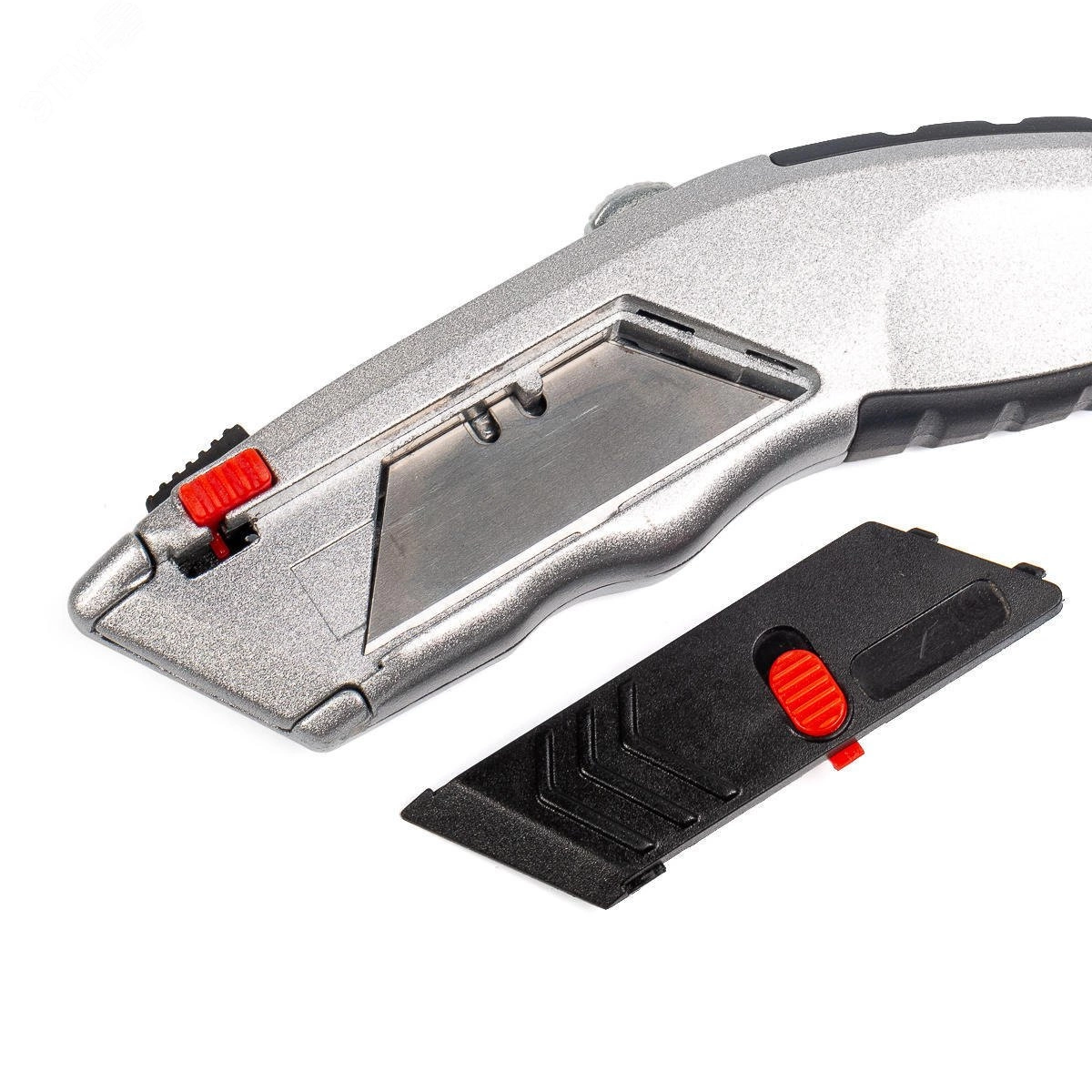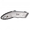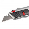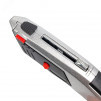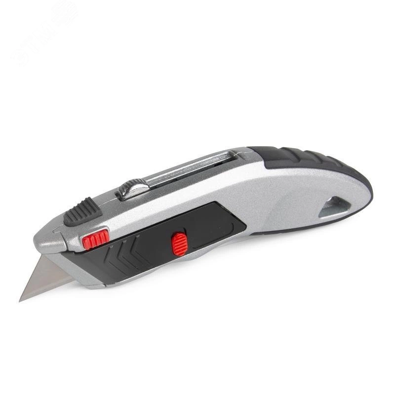 Предназначен для резки тонких строительных материалов (бумага, картон, пластик, резина и т.д.). Выдвижное двустороннее трапециевидное лезвие. Ширина лезвия - 18мм. Материал лезвий - инструментальная сталь. Система быстрой автозамены лезвий. В рукоятке ножа предусмотрен отсек для хранения лезвий, 7 лезвий в комплекте (1+6 в отсеке хранения). Эргономичный корпус из легкого сплава с нескользящими вставками. Прорезиненный упор для большого пальца. Корпус оснащен отверстием для подвешивания. Вес - 229г. Длина - 170мм
