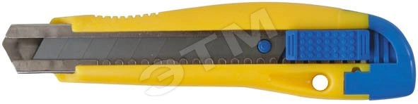 Отламывающиеся лезвие', с пластиковым прижимом. Материал - пластиковый корпус, усиленный металлической направляющей, лезвие из инструментальной стали. Упаковка - п/э пакет с картонным подвесом.